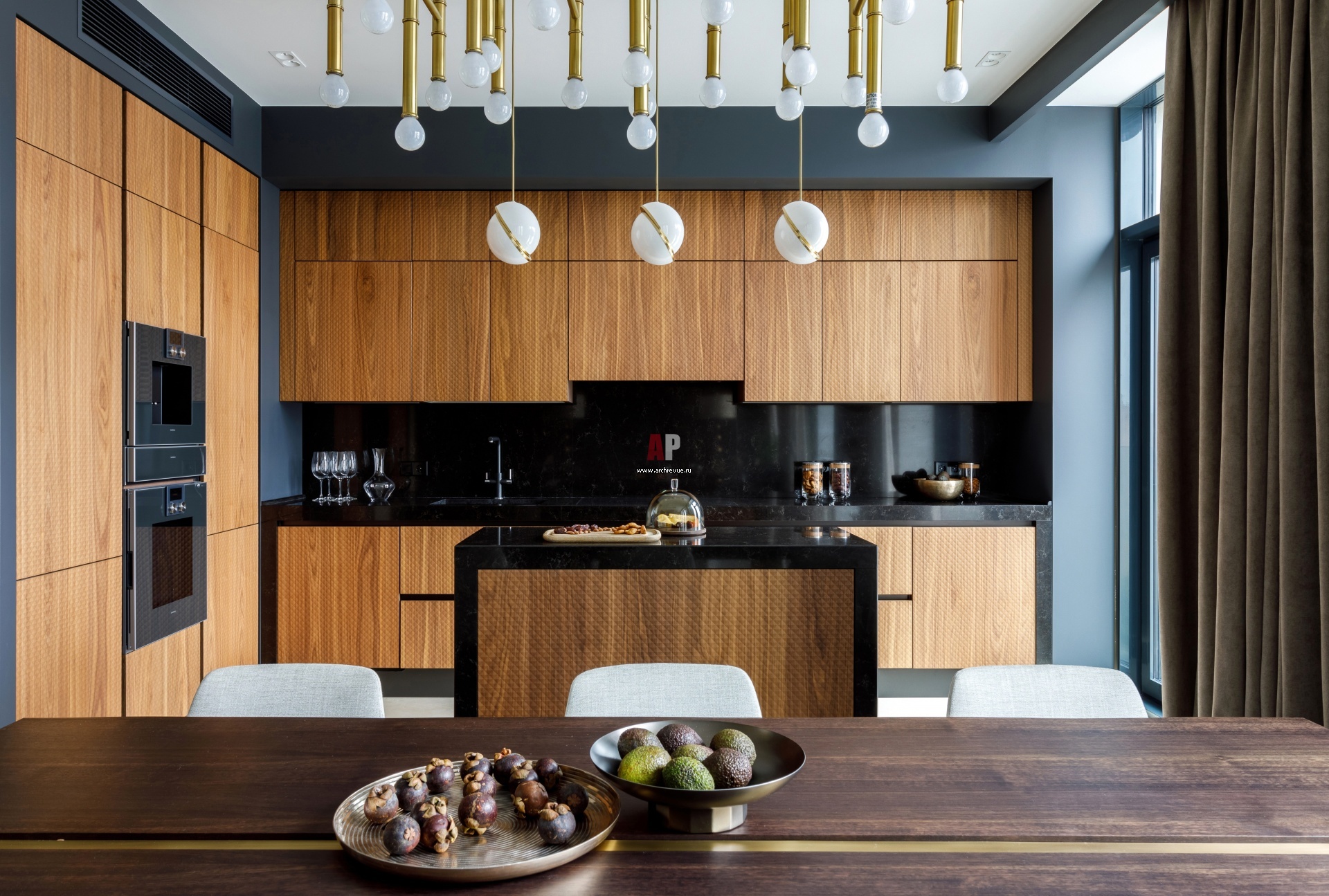 Для кухни выбрана необычная модель с красивым объемным шпоном. На тот момент объемные фасады из шпона древесины были абсолютной новинкой. Кухонная мебель, Old Line, модель Glamour.