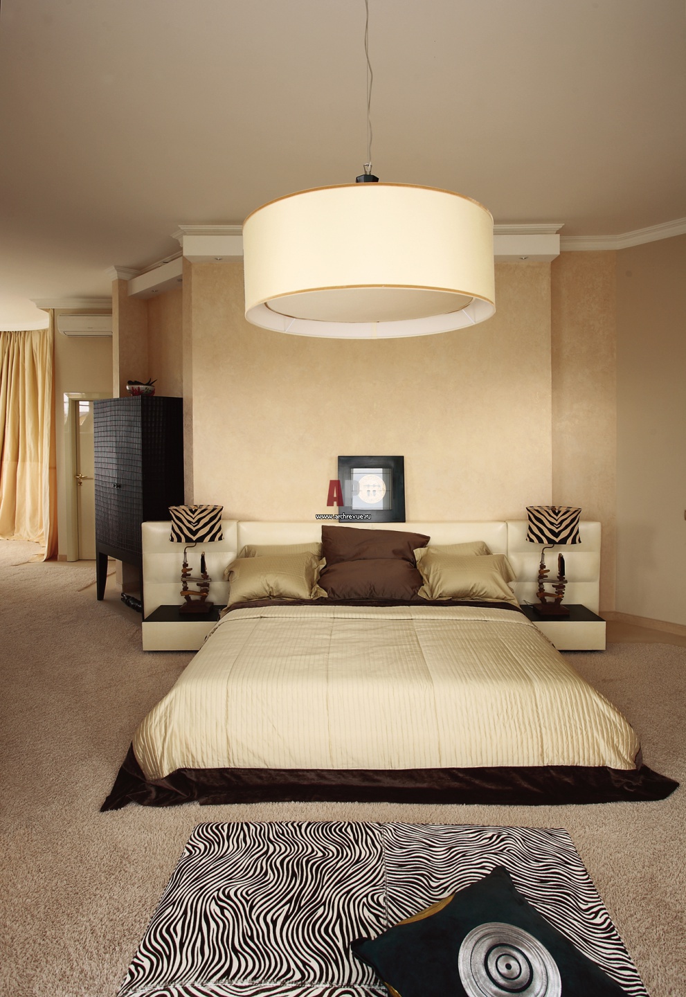 Хозяйская спальня в ар-деко расположена по периметру фасада третьего этажа. Кровать Fendi с изголовьем из белой кожи акцентирована светильником с абажуром-барабаном из ткани. Пол устлан ковром с высоким ворсом.