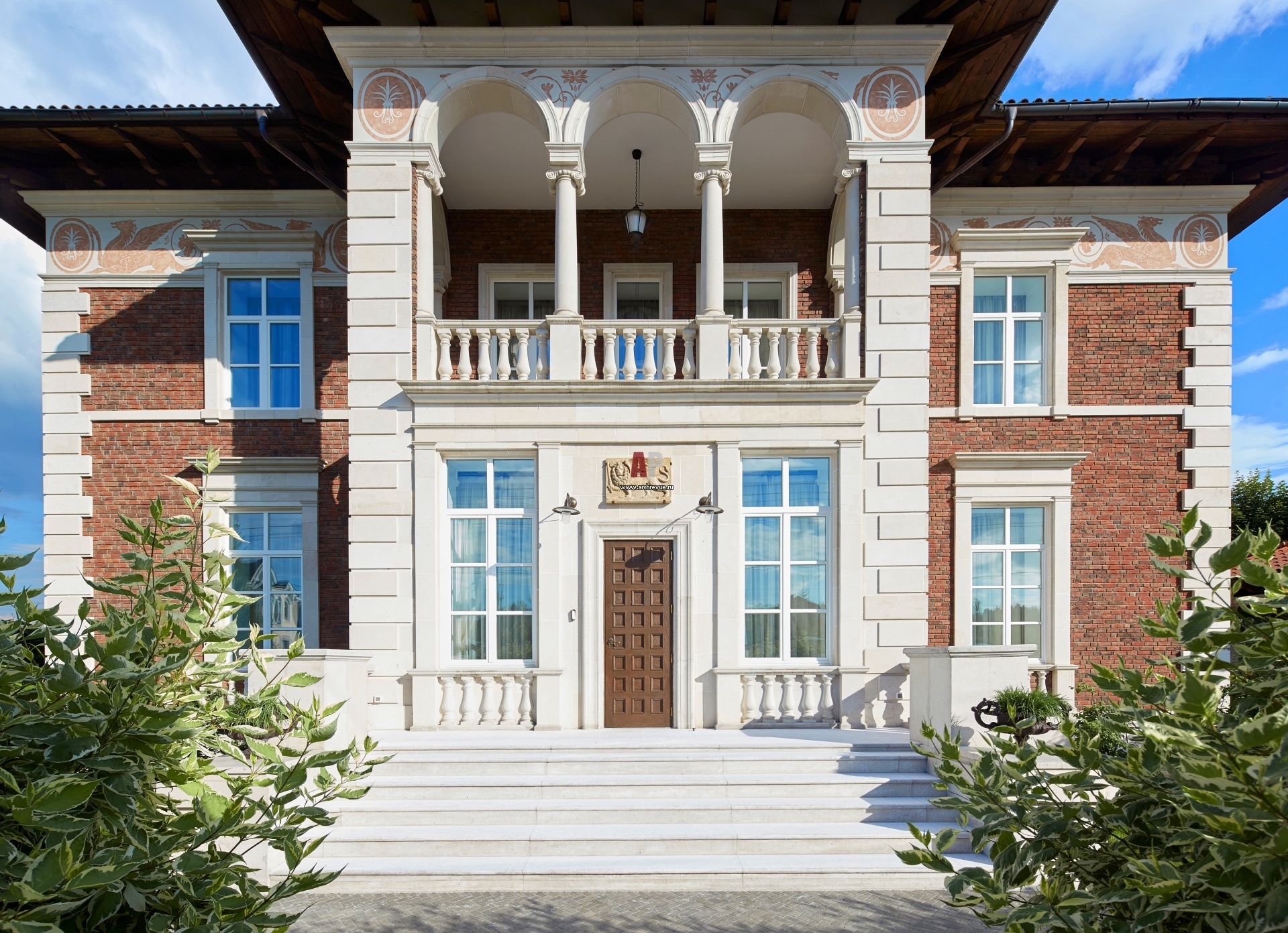 Двухэтажный дом с классической архитектурой, плоской кровлей и авторским декором. Главный фасад. Колонны, руст – каменные. Фриз, декоративные вставки – трафаретная роспись по мотивам декора классических итальянских вилл.