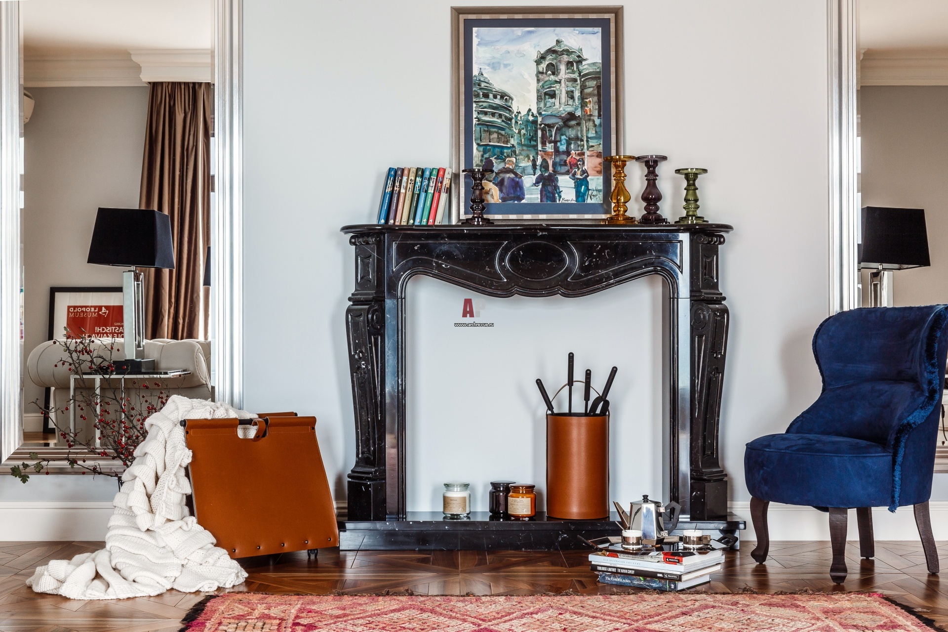 Импровизированный камин из черного резного камня обрамляют высокие зеркала. Они, как и высокий плинтус, масштабируют пространство и придают ему черты классического благородного интерьера.