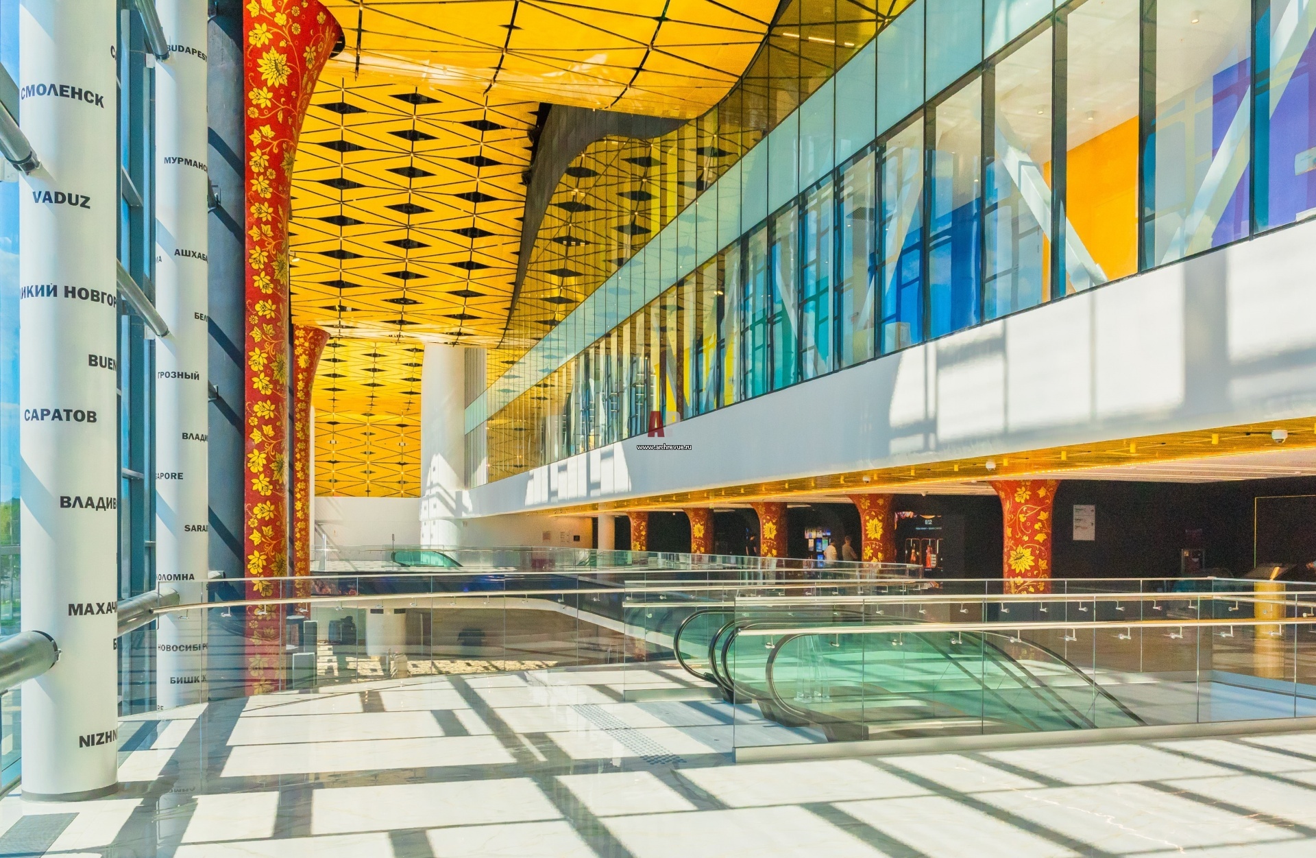 Волнообразный потолок подшит объемными 3d-панелями из алюминия Sevalcon, коллекция LUX, цвет WINNER GOLD.