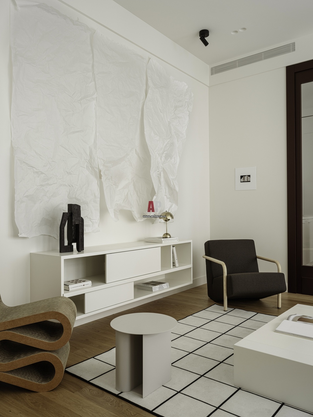 Квартира в эстетике авангарда для молодого человека. Интерьер гостиной.