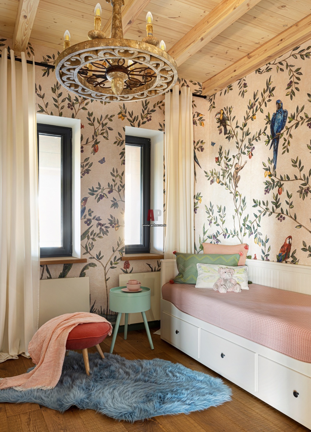 Детская девочки. Обои с рисунком «Райский сад», Factura Wallpaper. Кровать, «Икеа». Столик, пуфик, Zara Home.
