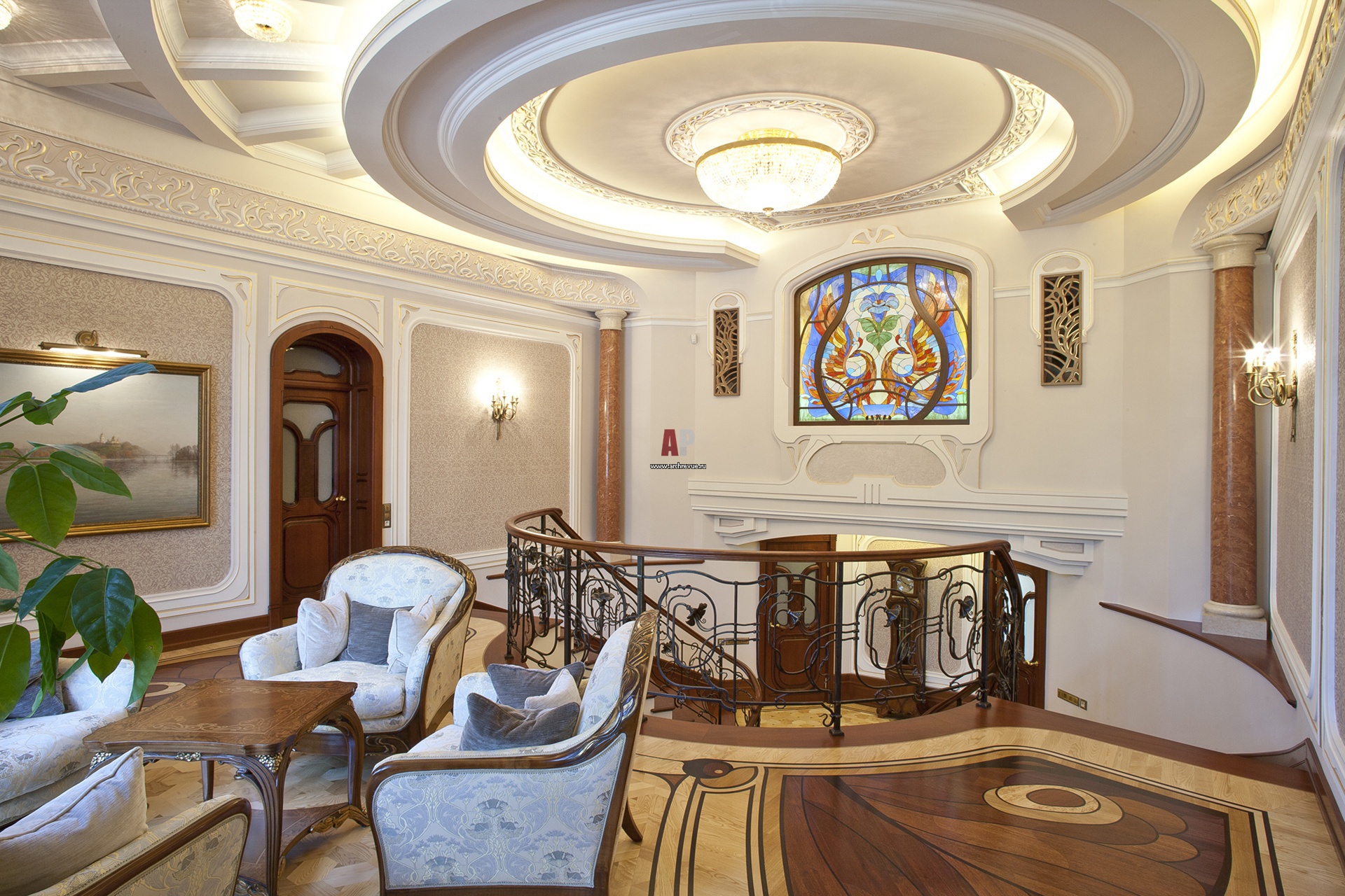 Фото интерьера холла второго этажа в стиле модерн. Украшение лестничного холла – художественный витраж с изображением двух Жар-Птиц. Декор паркетного пола из экзотических пород дерева вдохновлен красотой крыльев бабочки.