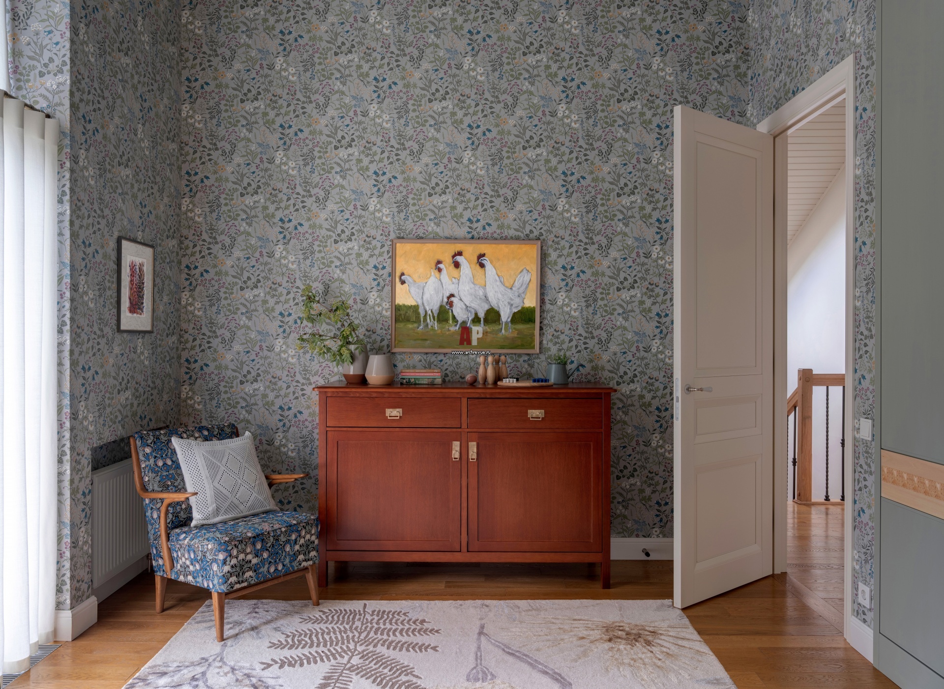 Спальня дочери. Комод сделан на заказ. Над ним – картина Евгения Болгова «Куриный закат». Над креслом – акварель Евгении Полгар.