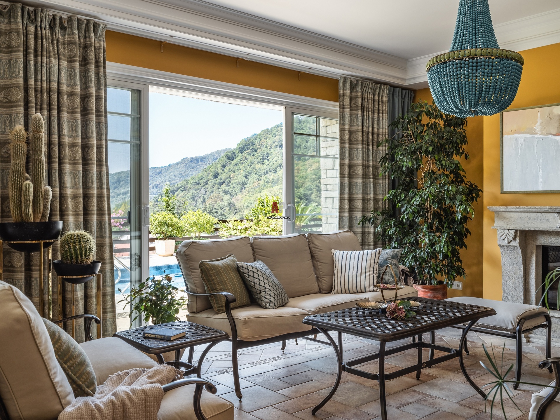 Зона отдыха оформлена в теплых оттенках шафрана. За дверями – выход в сад и к бассейну. На полу – ковер из итальянской состаренной плитки. «Нам очень понравилась эта коллекция, но она была уже выведена из производства. Поэтому пришлось собирать панно из остатков, которые уже были произведены – мы использовали 18 разных размеров и позиций!» - рассказывает дизайнер.