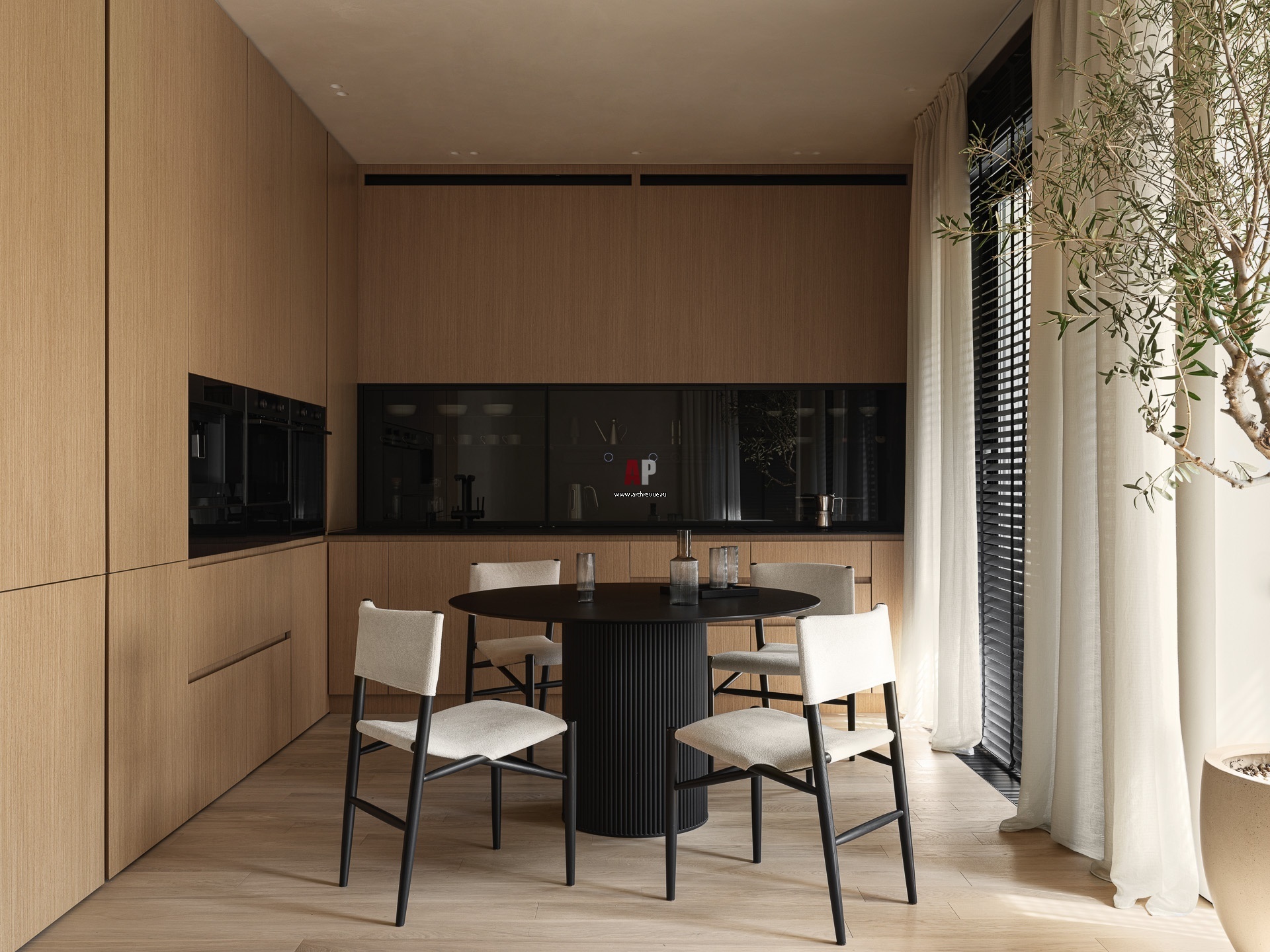 На компактной кухне требовалось предусмотреть много мест хранения и свободную рабочую зону. Дизайнеры сделали углубленную столешницу глубиной 1 м с раздвижной системой доступа. Ниша выполнена полностью в том же материале, как и сама столешница. В самом коробе над нишей разместились трассы системы кондиционирования, внутри – полки для посуды и техники, а также уникальный электрический трек, так что можно кастомизировать эту зону под любые запросы в будущем.