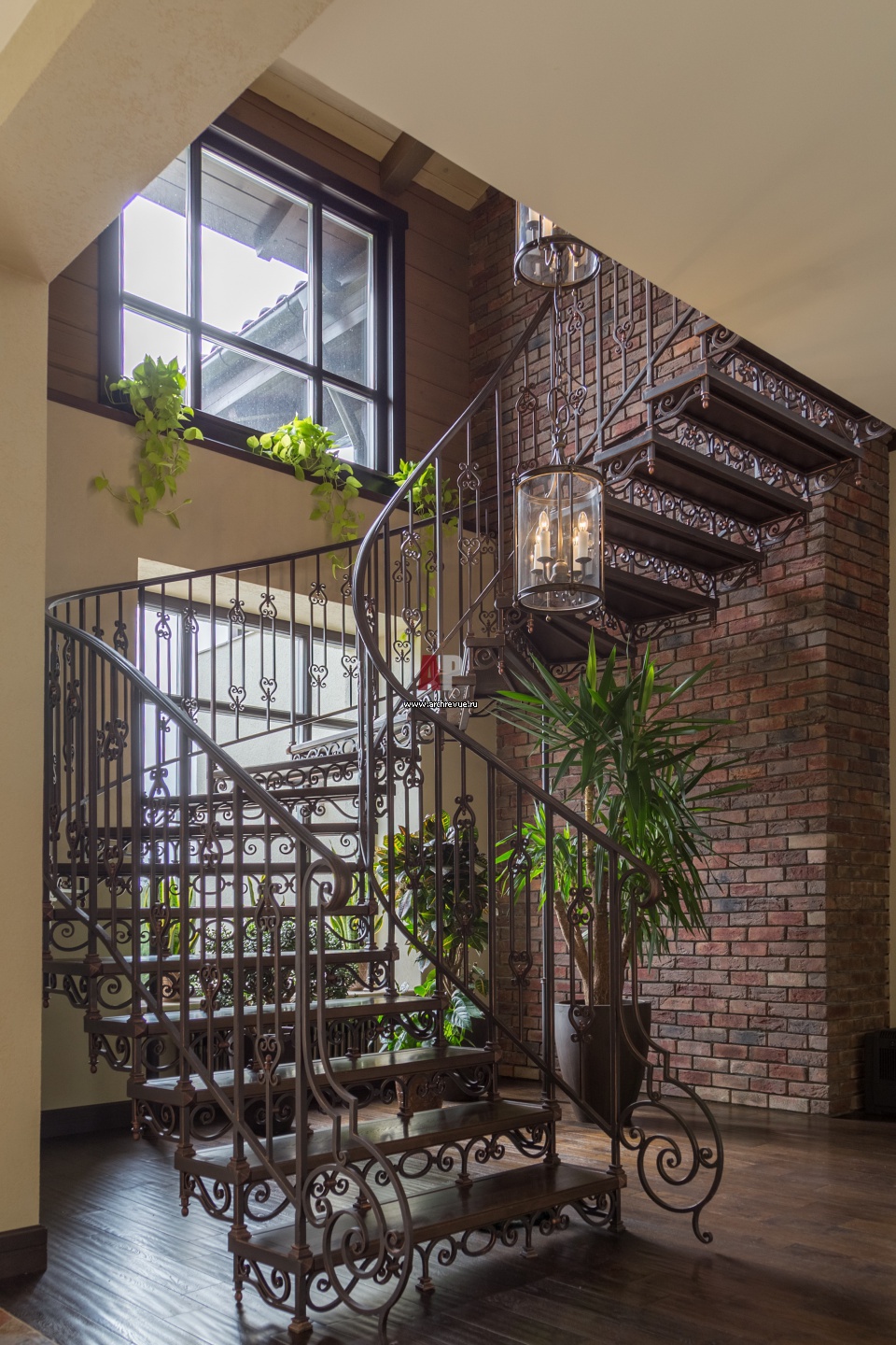 Ажурная лестница из кованого металла смотрится эффектно на фоне брутальной кирпичной кладки. Лицевой кирпич Terca, Wienerberger.