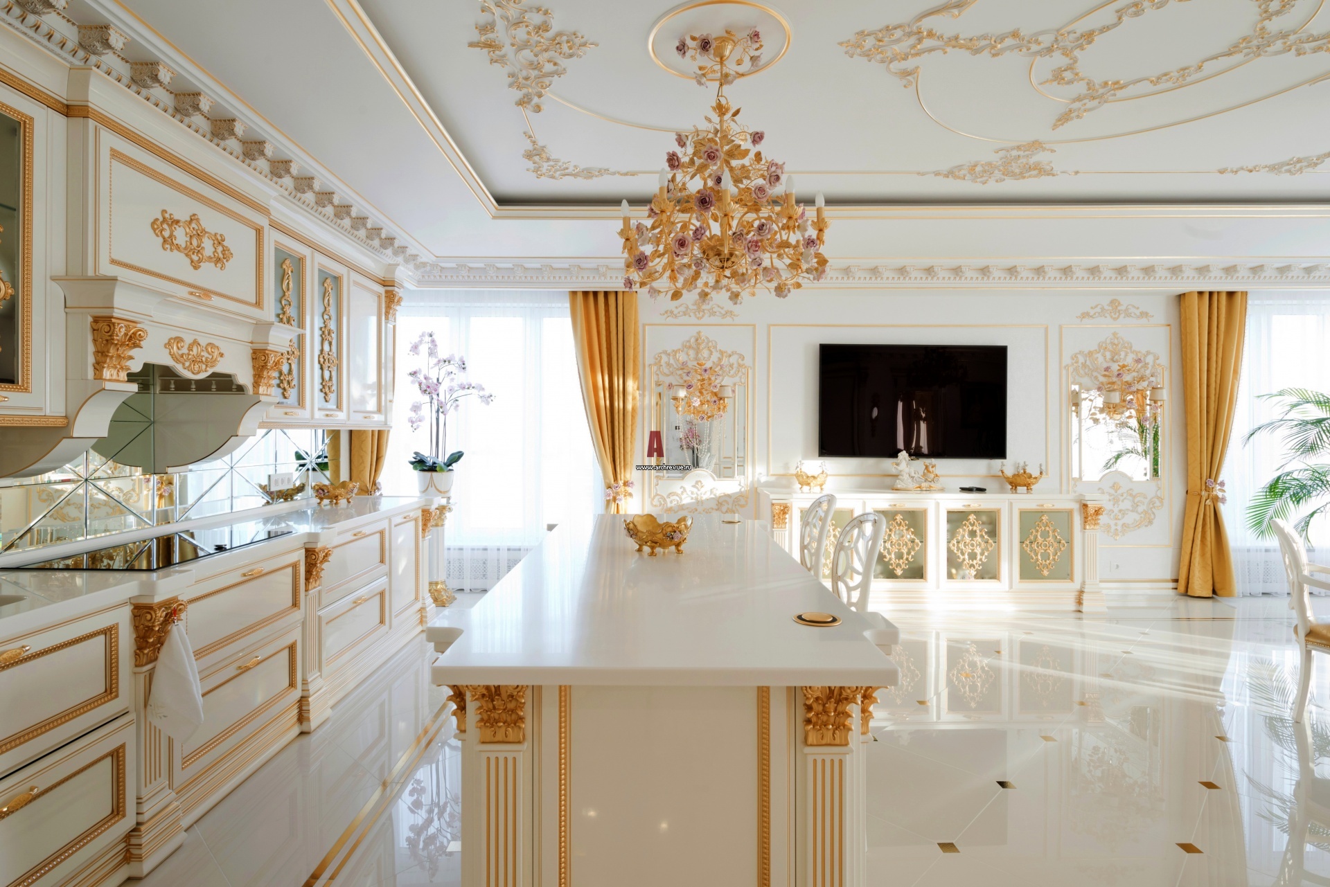 Интерьер кухни в парадном классическом стиле. Белые фасады кухни Tomassi Cucine украшены золотым орнаментом.