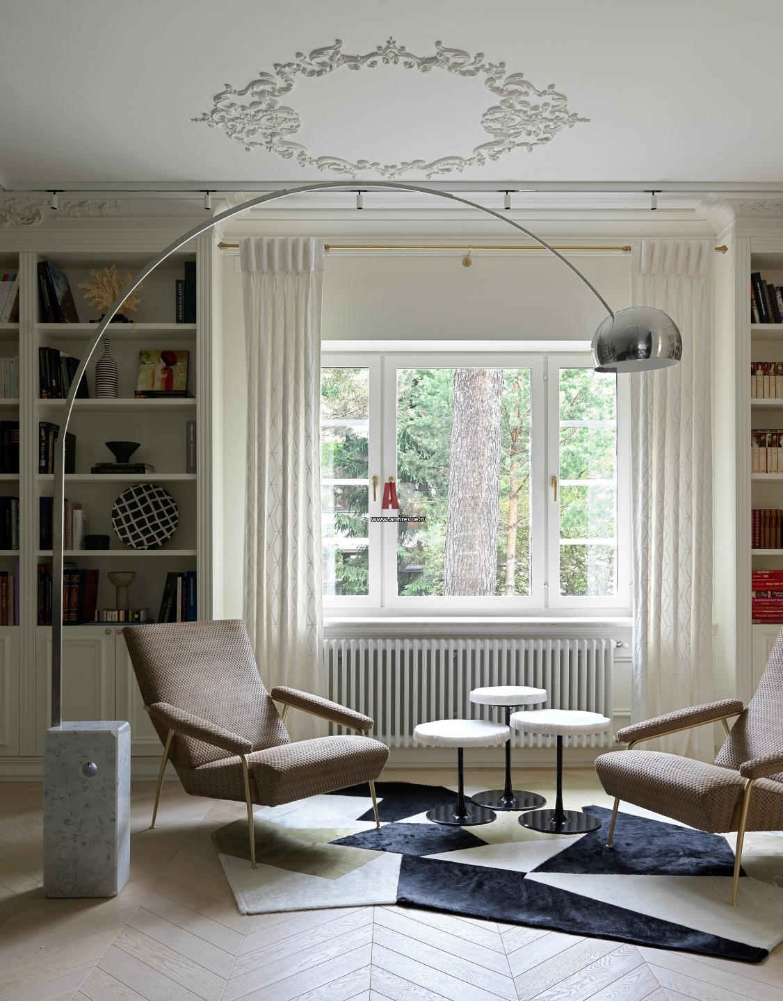 Дом с парижским шиком. В эклектичном интерьере присутствуют черты османовского стиля или à la Parisienne. Стены и шкафы окрашены в белый цвет.