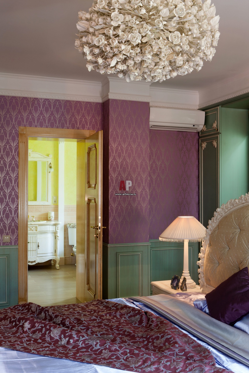 Хозяйская спальня с выходом в собственную ванную. На стенах – лиловые обои с орнаментов в стиле ар нуво, низ отделан буазери из дерева серо-бирюзового цвета с золотом. Люстра из розочек цвета «белое золото».