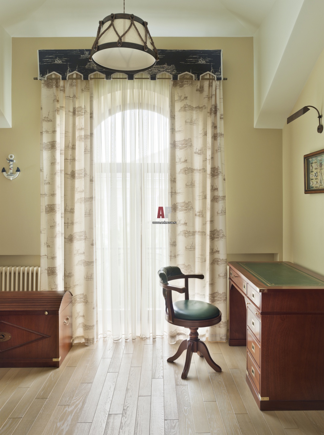 Зона кабинета на втором этаже. Письменный стол из темного дерева расположен у высокого арочного окна. Половая доска из беленого дуба.