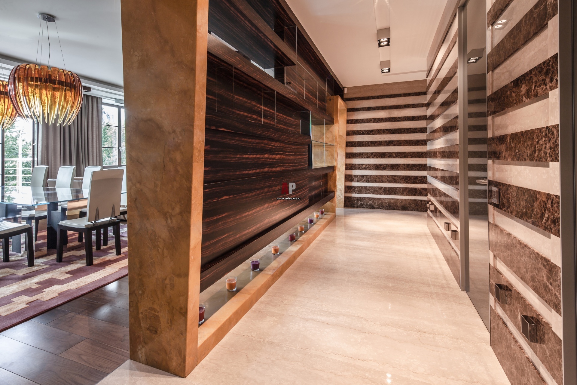 Холл оформлен парадным порталом из золотистого мрамора, он служит входом в общую гостиную-столовую кухню. От прихожей гостиную отгораживает оригинальная перегородка из камня и дерева. Она служит системой хранения и витриной для предметов декора. Изделия из дерева, изготовление «АФ Ника».