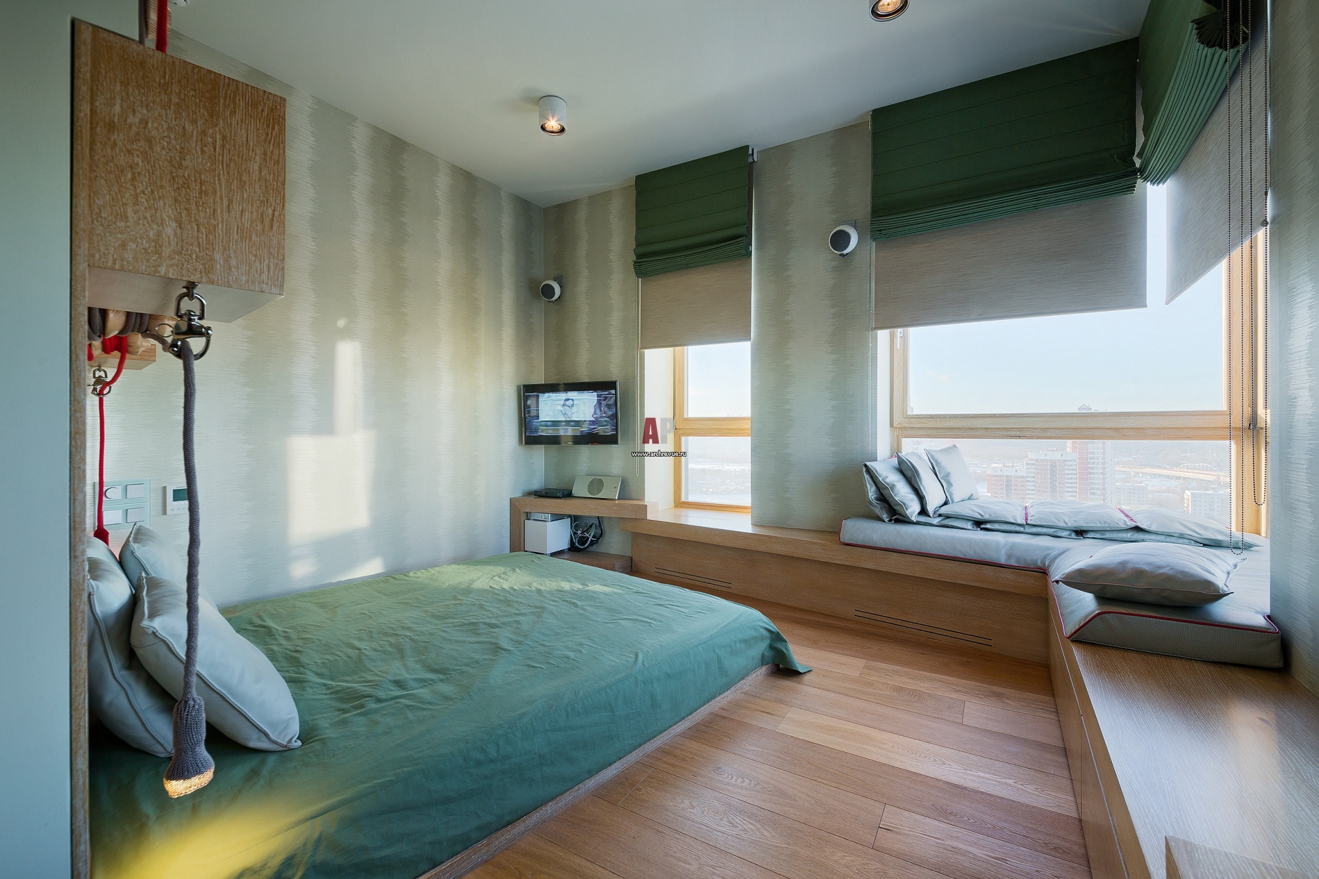 Низко расположенные окна в спальне позволили создать эксплуатируемые подоконники. Широкая столешница из дерева и экраны для радиаторов из дерева создают место для медитации и отдыха.