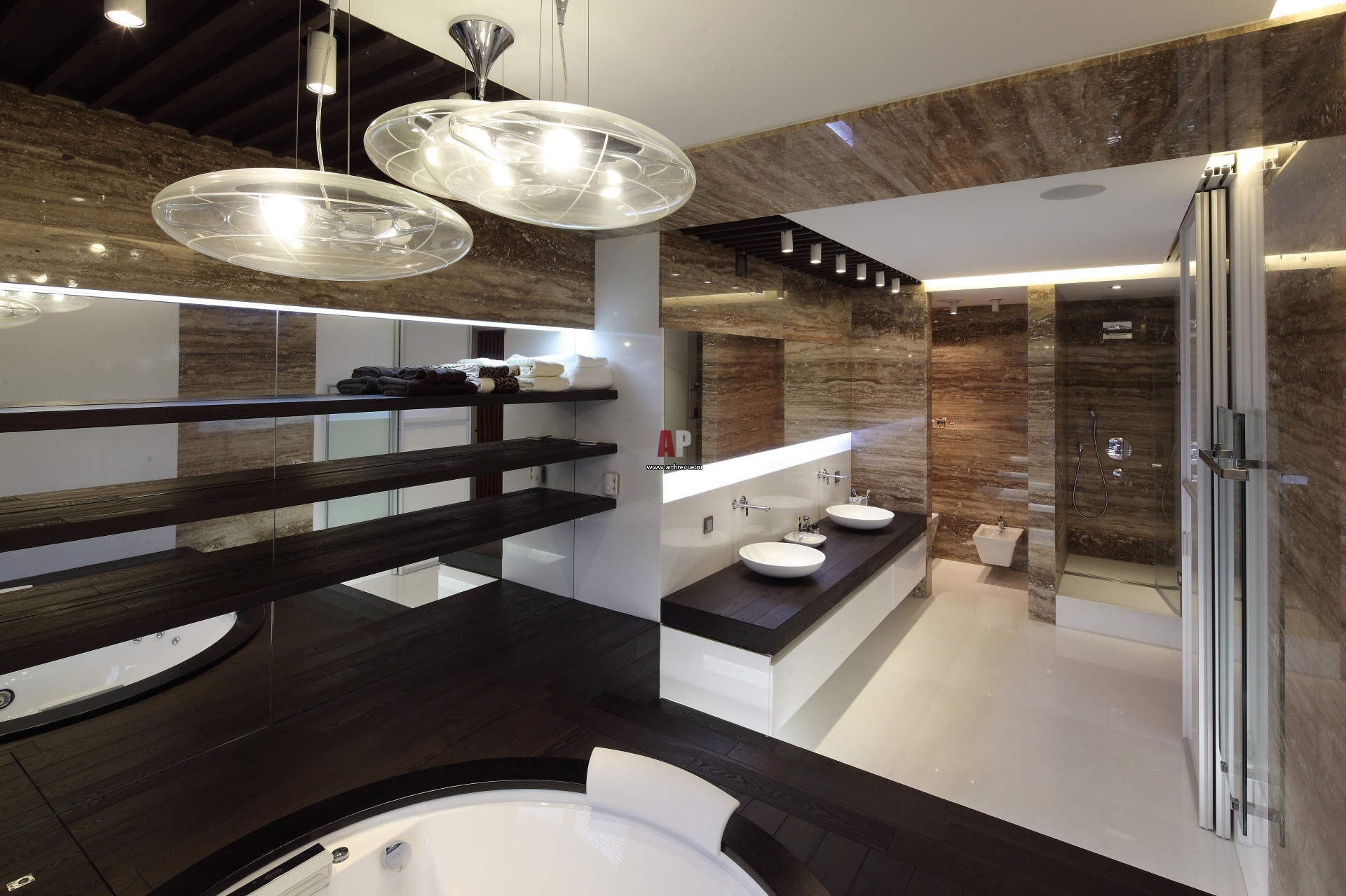 Дизайн хозяйской ванной комнаты выполнен в современном стиле с использованием коричнево-бежевого камня и темного дерева. Столешница умывальника с двумя раковинами выполнена из дерева.