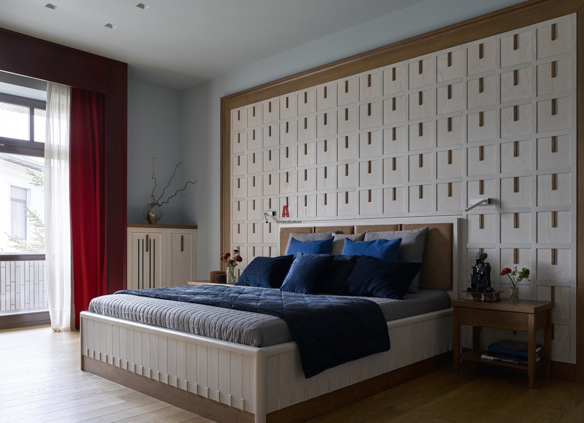 Кровать в хозяйской спальне обрамлена эффектным панно из двух видов дерева – массива выбеленного ясеня и дуба. Она сделана на заказ на российском мебельном производстве.