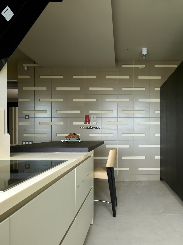Объем гостевого санузла со стороны кухни и гостиной оформлен деревянными панелями с прорезями. Сквозь S-образных панелей цвета кофе с молоком просвечивает фоновый бежевый цвет стен.