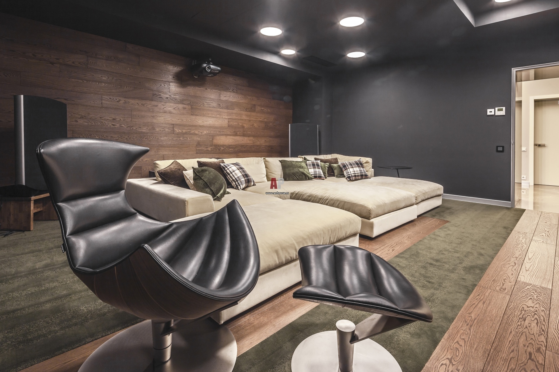 В цоколе помимо СПА-комплекса расположен домашний кинозал с профессиональным оборудованием и акустикой.