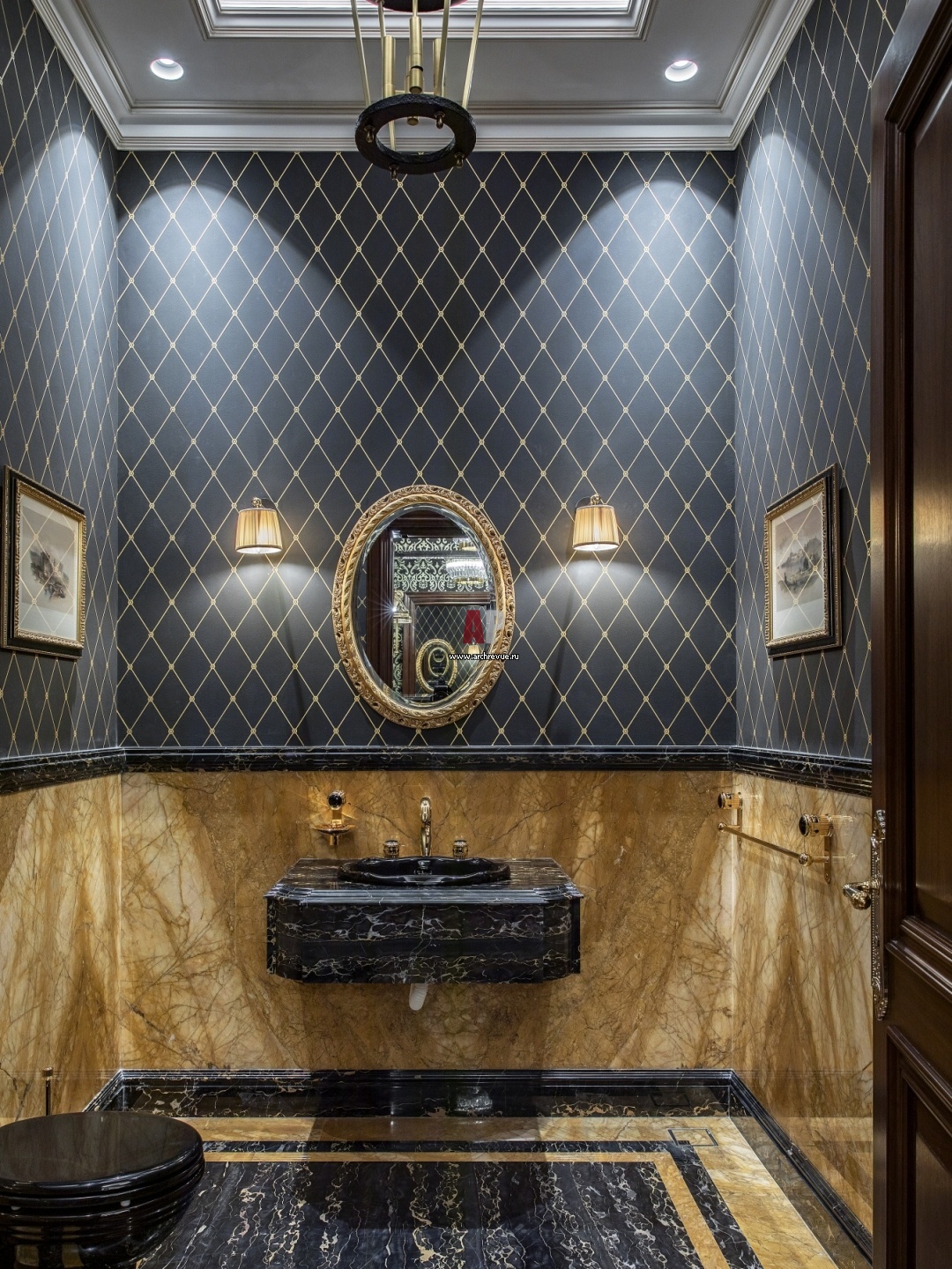 Эклектичная резиденция на Ближнем Востоке. Интерьер гостевого санузла с темными стенами и золотистым камнем.