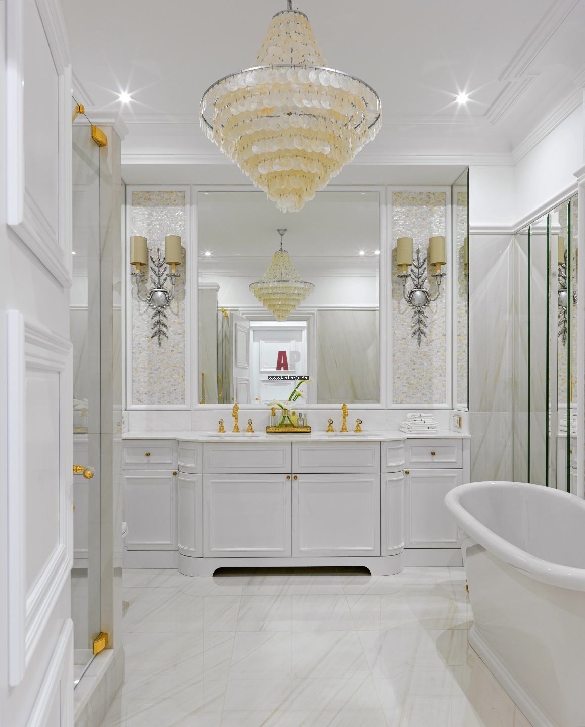 Хозяйская ванная комната исполнена в нюансной серо-белой гамме с золотыми акцентами. Пол из мрамора Bianco Namibia. Стены оформлены перламутровой мозаикой. Подвески люстры также из натурального перламутра.