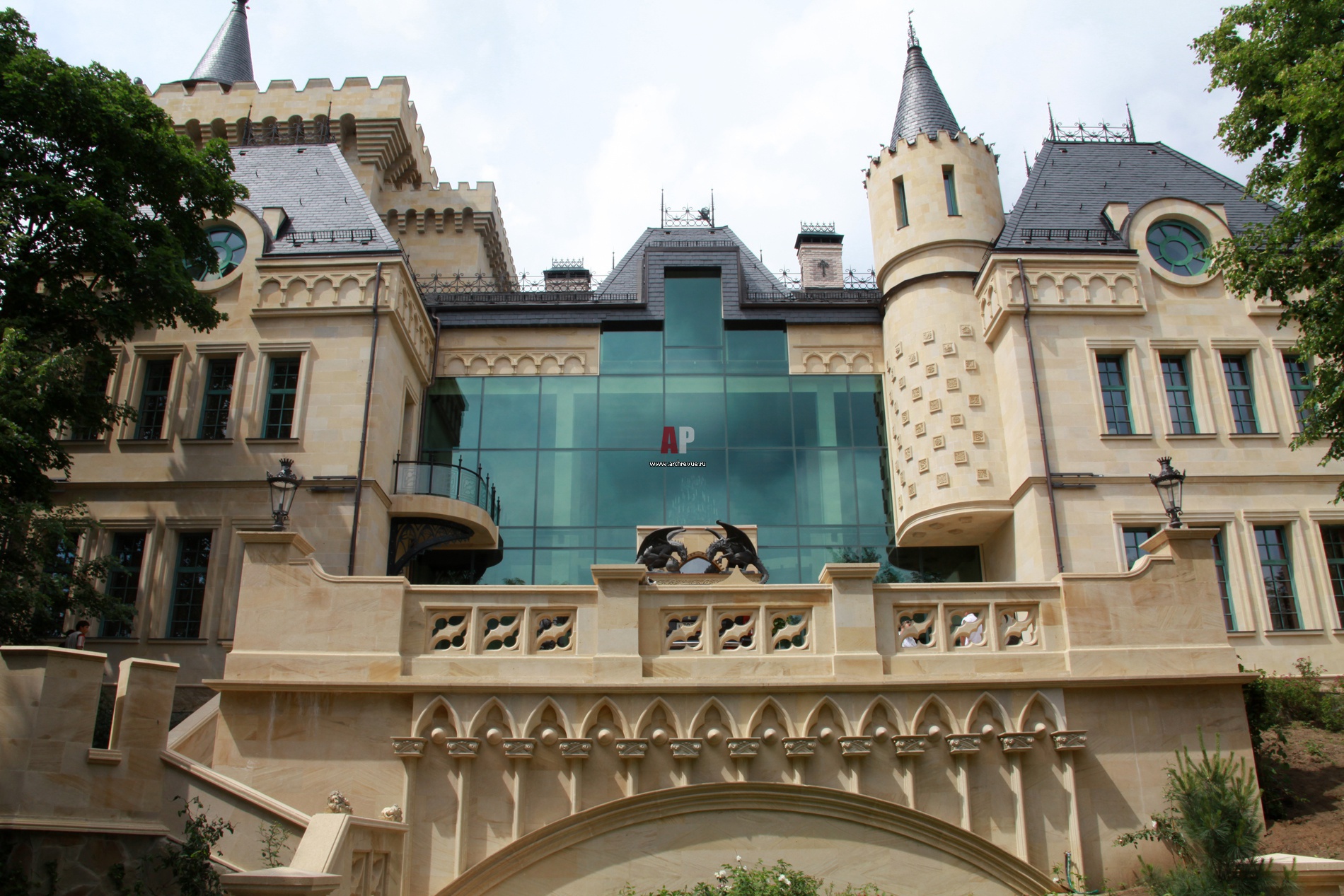 Главный фасад замка на 2 этажа закрыт стеклянным витражом. Стекло придает экстерьерам сходство с реконструированными старинными европейскими сооружениями и сообщает интерьерам замка легкость и воздушность.