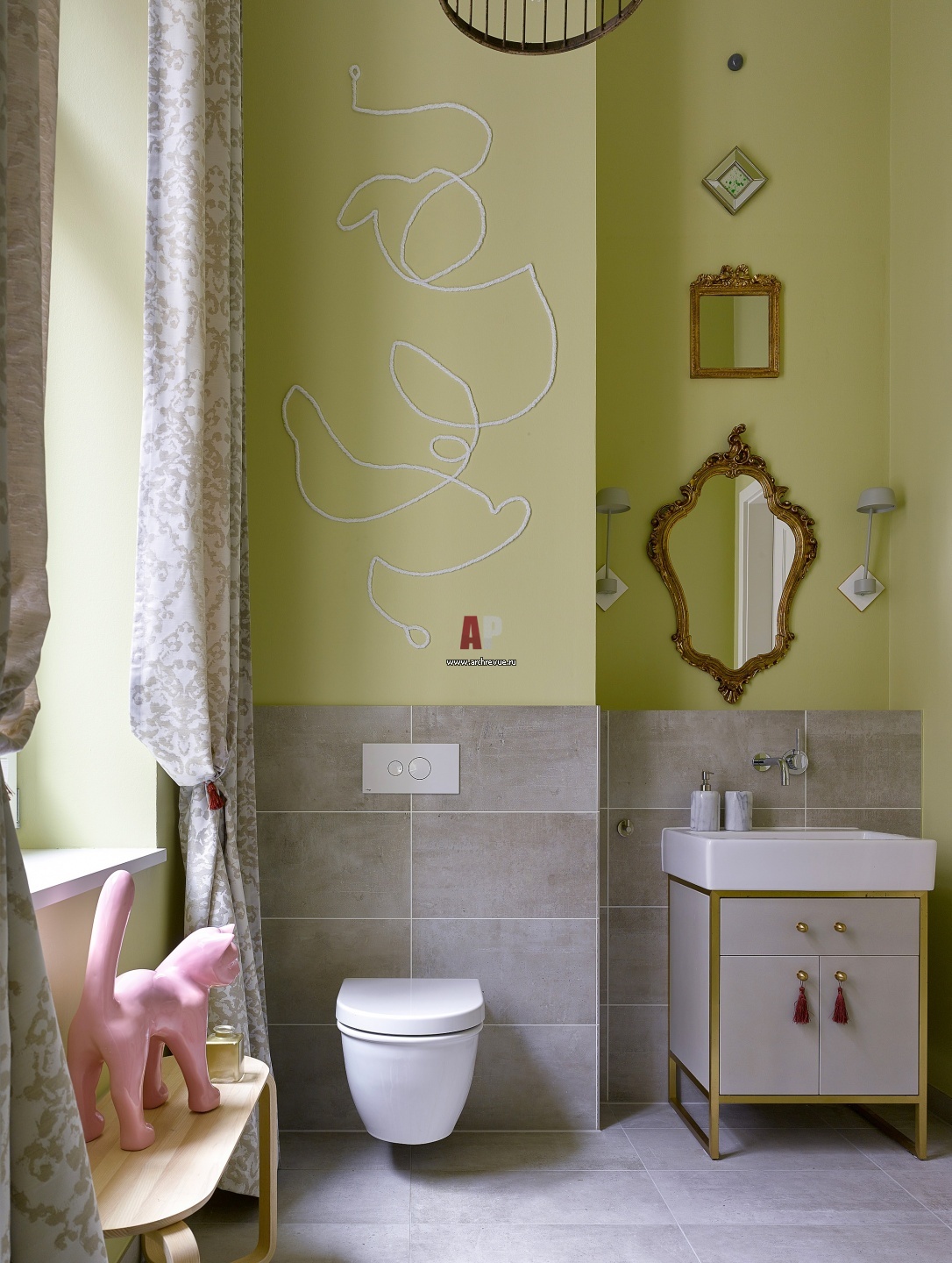 Интерьер одного из санузлов архитекторы выкрасили в цвет зеленого яблока. Композиция на стене – импровизация из шнура, который бы куплен в ближайшем художественном магазине.