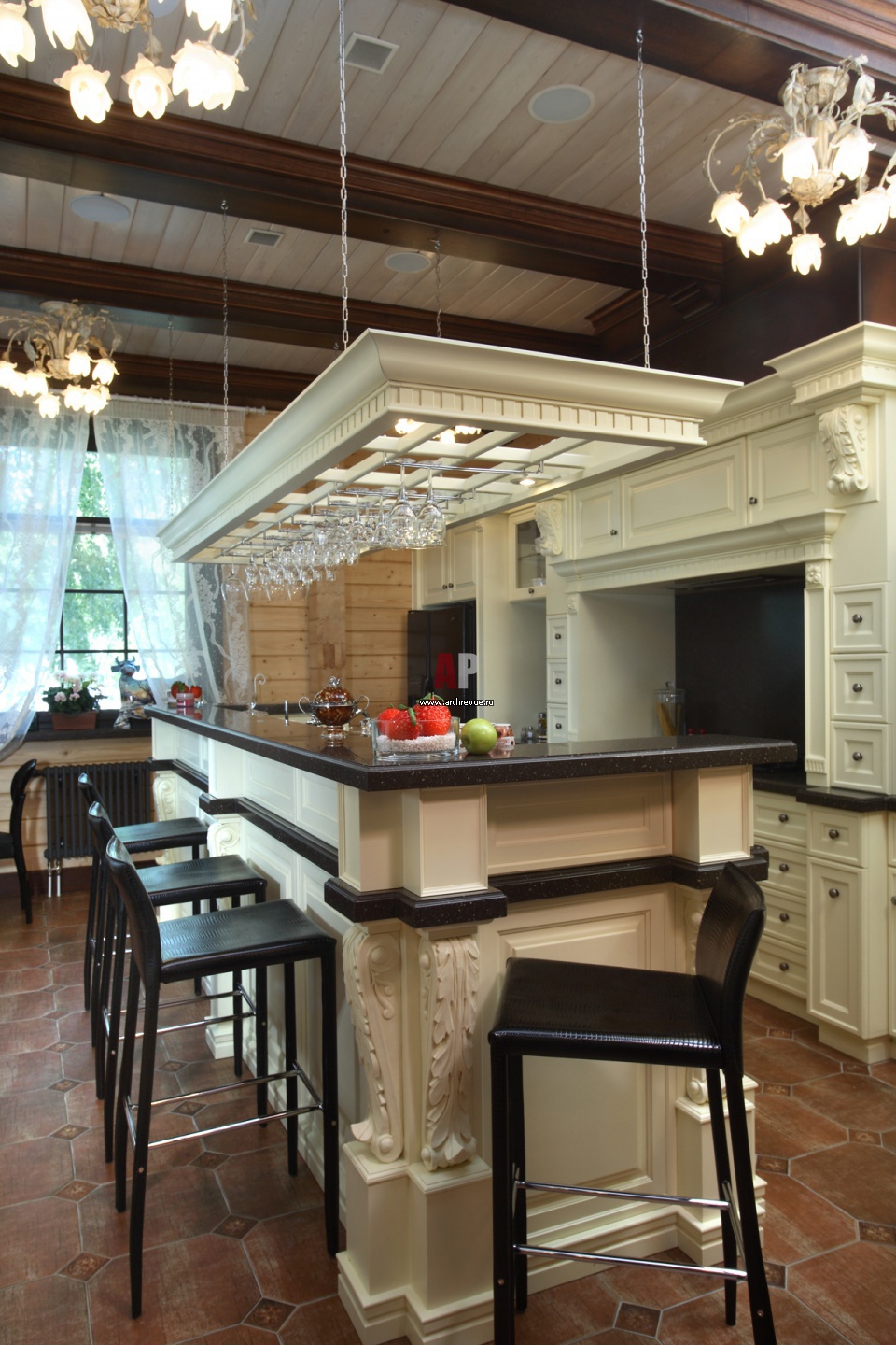 Кухонный гарнитур выполнен по эскизам авторов проекта, изготовление «Табула». Балочные потолки из лиственницы, изготовление «Ольховенко А. А. ИП».
