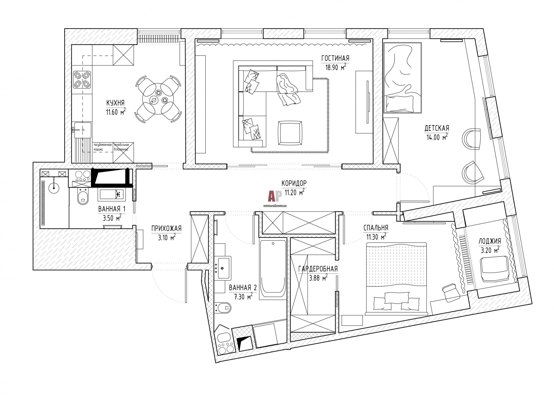 Планировка трехкомнатной квартиры в новостройке в Сколково. Общая площадь – 91 кв. м.