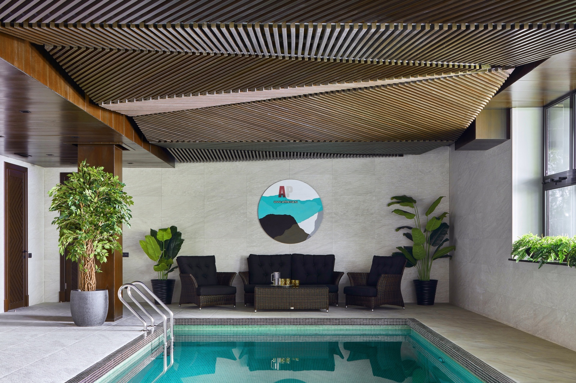 Бассейн расположен в высоком цокольном этаже. От небольшой высоты помещения внимание отвлекает сложной форма потолок из деревянных реечных панелей с ломаной геометрией и подсветкой. Стены, пол – плиты песчаника.