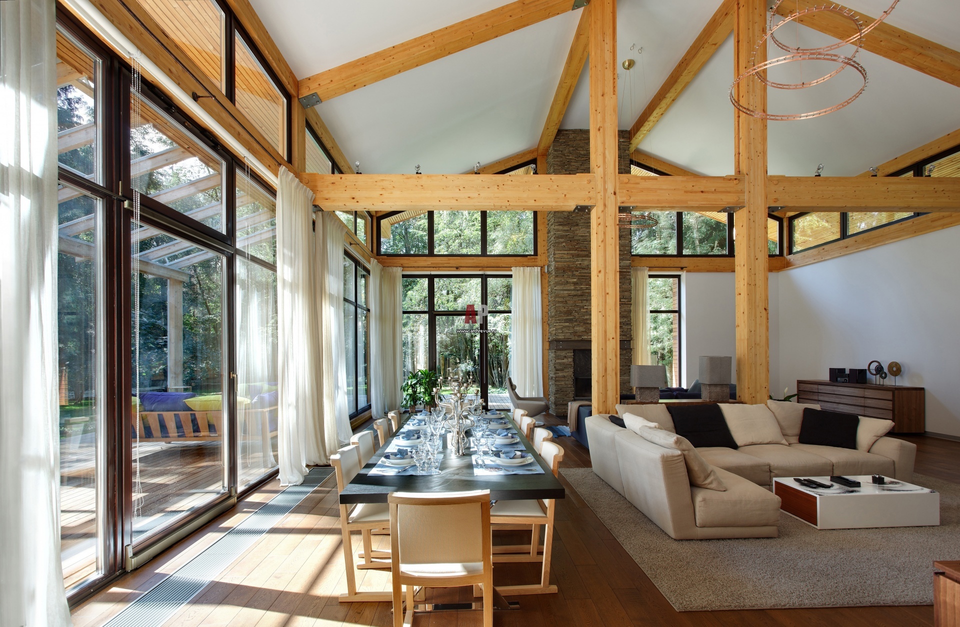 Интерьер двусветной гостиной. Открытые деревянные клееные конструкции выполнены из сосны. Светильники, Modular. Диван, B&B Italia.