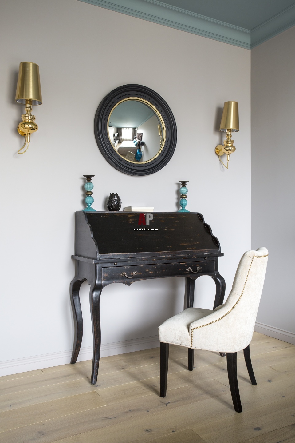 Фото интерьера женской спальни. Кресло, Eichholtz. Потолочные карнизы Orac Decor, поставщик «Ампир Декор».