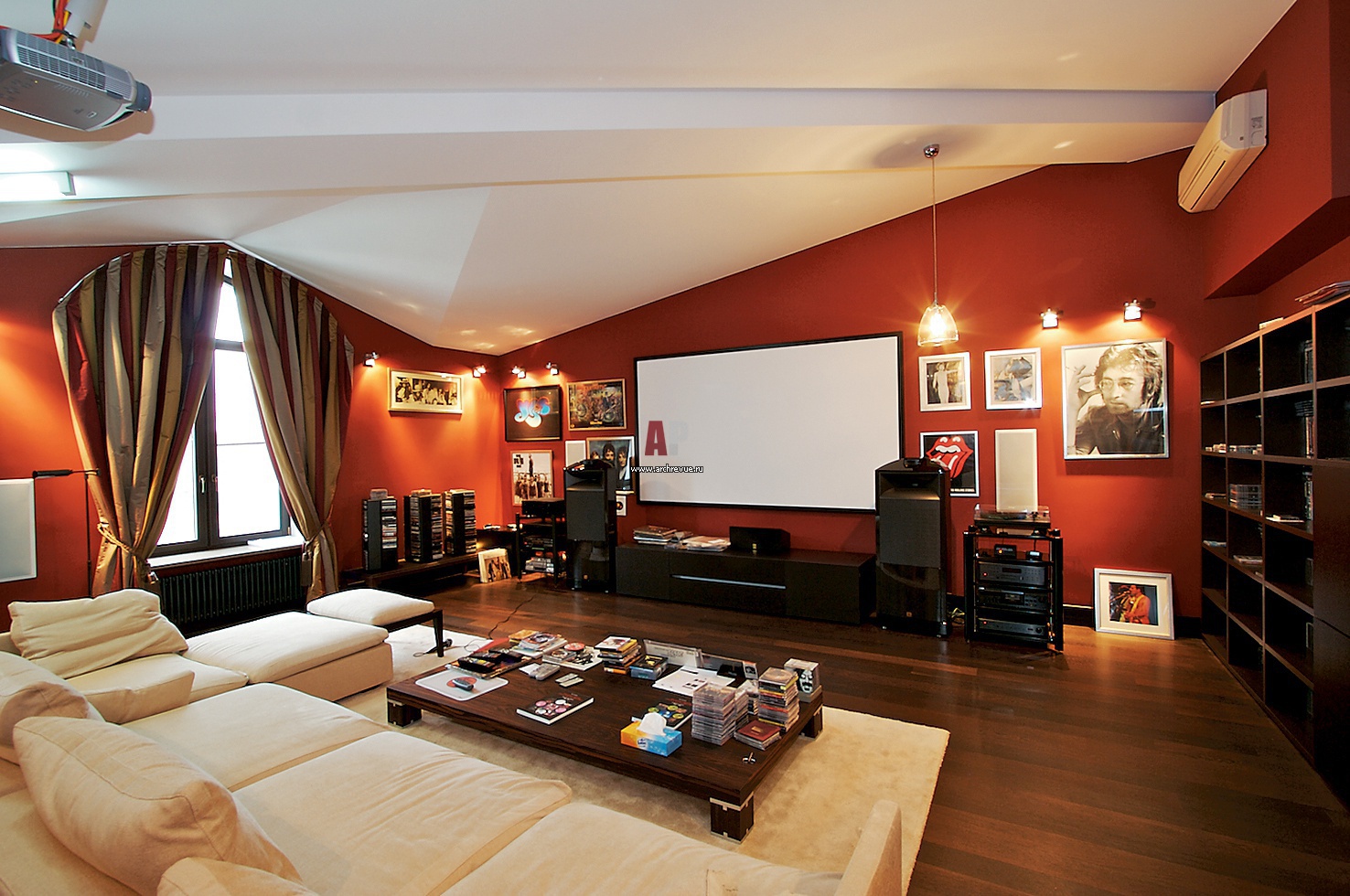 Домашний кинотеатр с профессиональным оборудованием находится в цокольном этаже. Стены помещения выкрашены в яркий красный цвет. Окна в деревянных рамах.