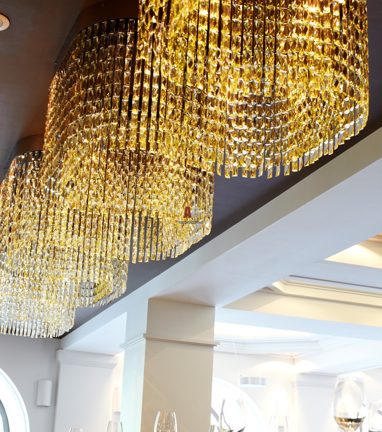 Светильник-змейка выполнен из золотистого стекла, производитель «Геометрия». Он выгодно обогащает и зрительно собирает интерьер верхнего уровня.
