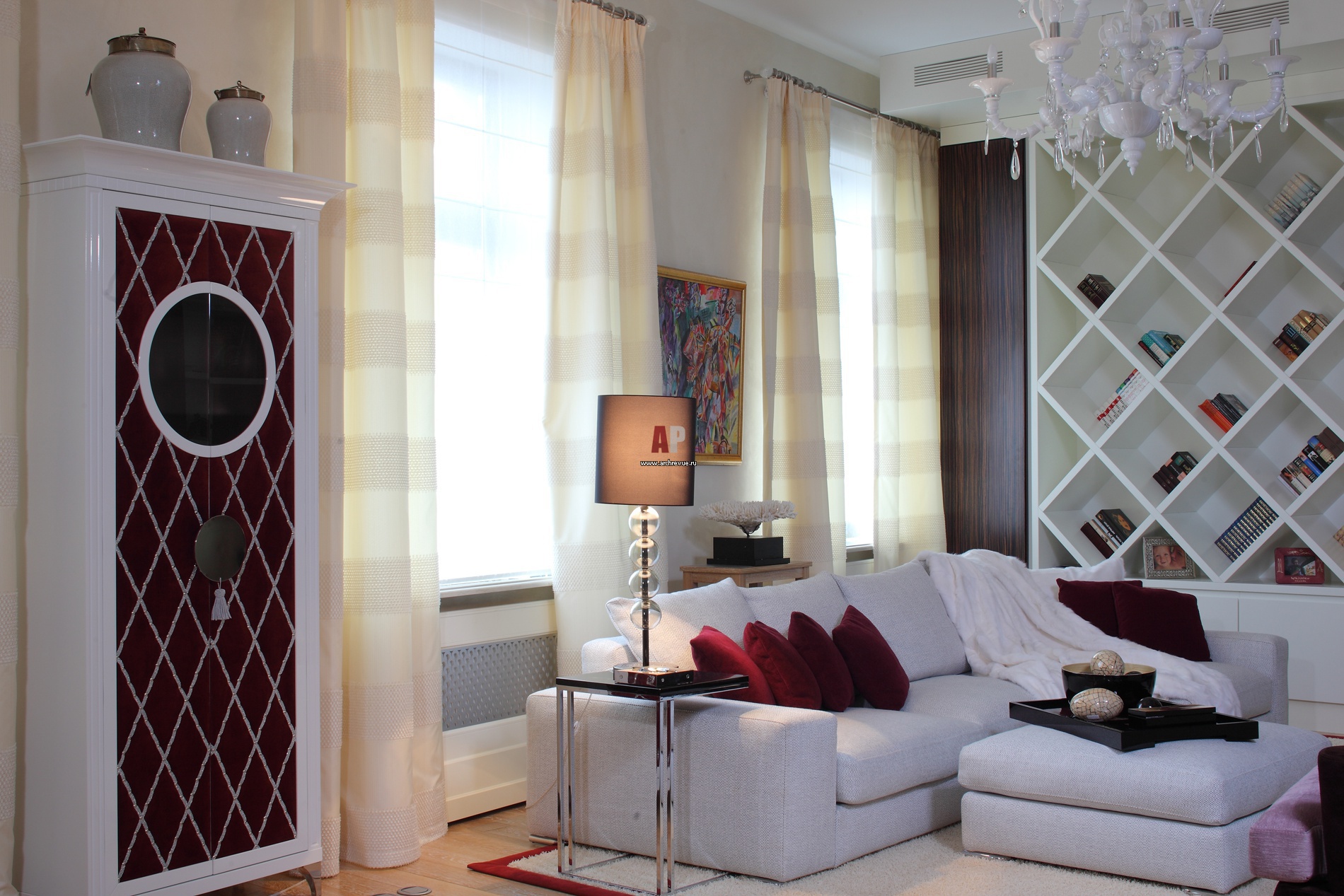 Библиотечный стеллаж имеет необычную форму. Его полки расположены по диагонали, а книги стоят в отсеках-ромбах. Белый стеллаж акцентирован пилястрами из эбенового дерева, они выполняют роль систем хранения. Шкаф для посуды выполнен по эскизам архитекторов. Он обит бархатом и создан под хозяйскую коллекцию посуды. Изготовление столярных изделий, компания «Александр Ней».