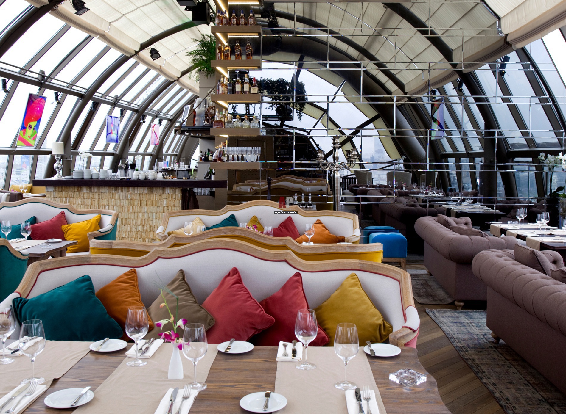 Верхний зал под стеклянным куполом оборудован солнцезащитными маркизами, поставщик i-Textile и зонирован барной стойкой. Над барной стойкой на тросах подвешен стеклянный балкон, где предполагается зона диджея. Единственная стена по центру помещения выложена зеркальными прямоугольниками и благодаря этому как бы растворяется в пространстве зала.