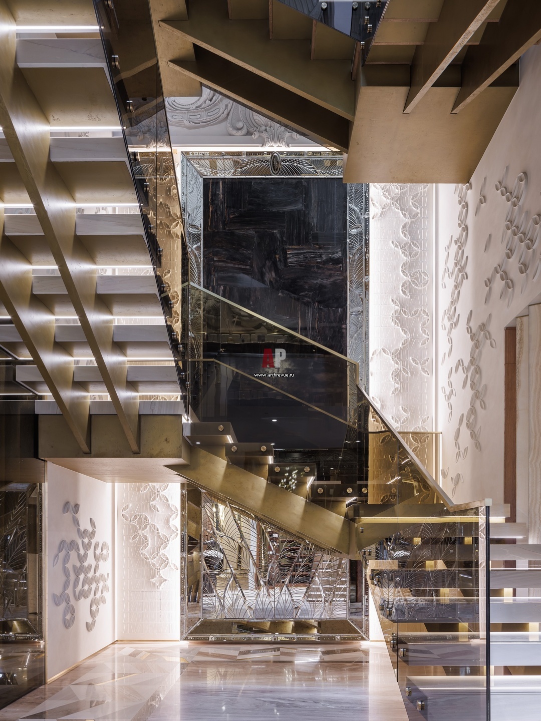 Лестница на второй этаж выглядит очень эффектно. Ступени выполнены из камня, ограждение – из тонированного в золотистый цвет стекла. На стенах – «хрустальный» витраж, ритмично повторяющийся современный гипсовый узор, природный камень.