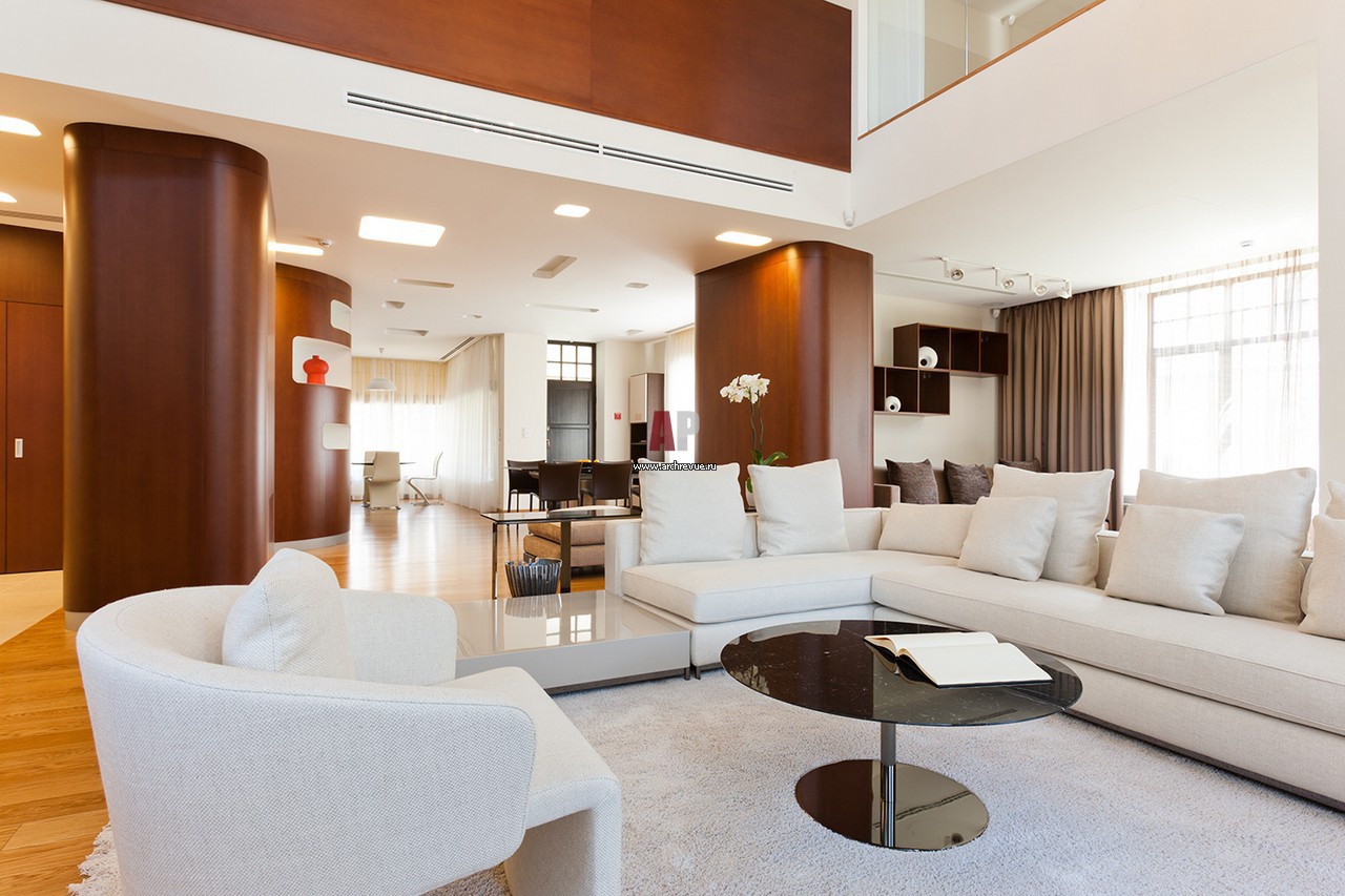 Гостиная – свободное пространство, элементами зонирования в нем служат три криволинейных объема, обшитых древесиной ореха.