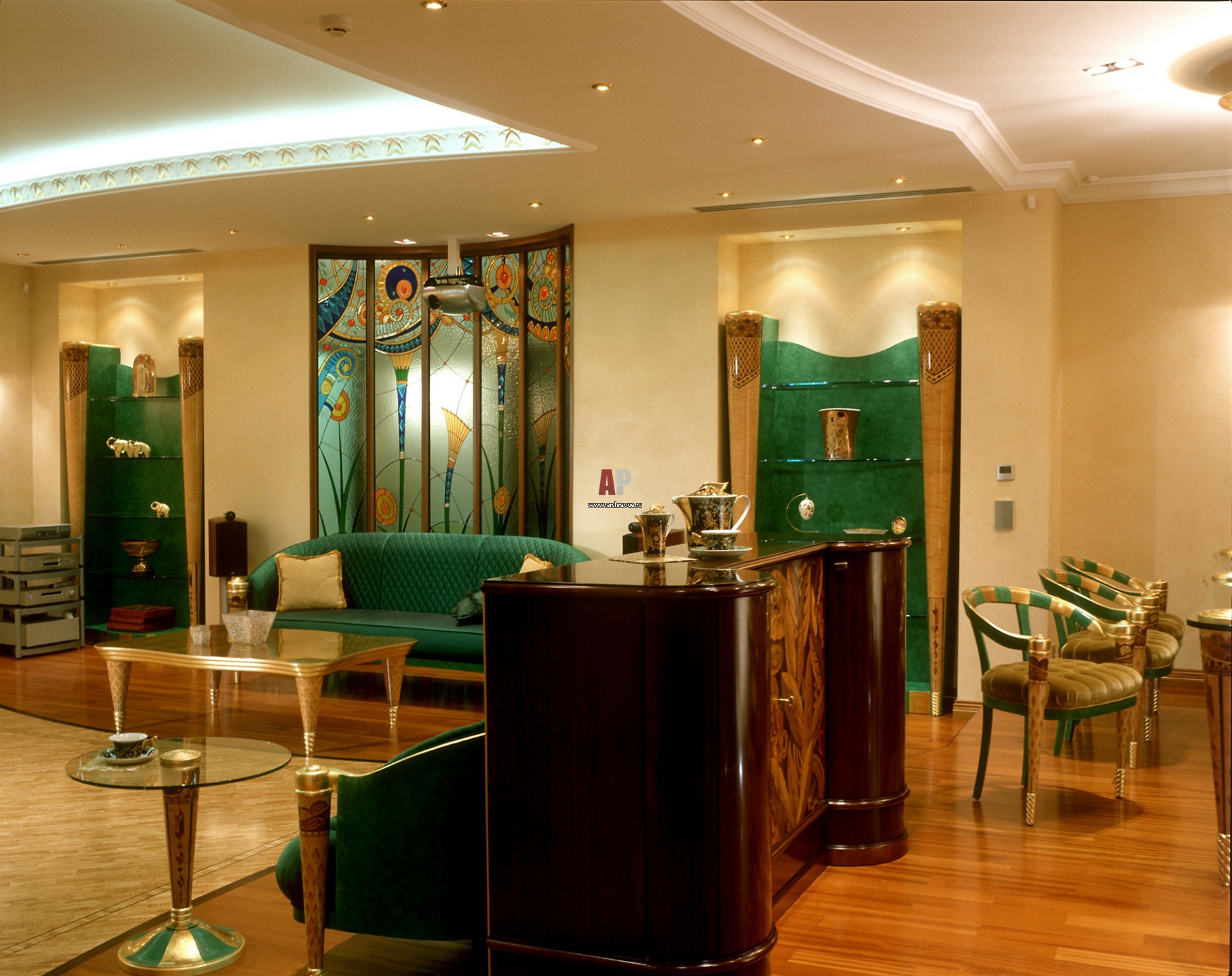 Стены в гостиной покрыты декоративной штукатуркой. Выкрасы были сделаны на заказ в два слоя: сначала золочение, а потом уже нужный оттенок.