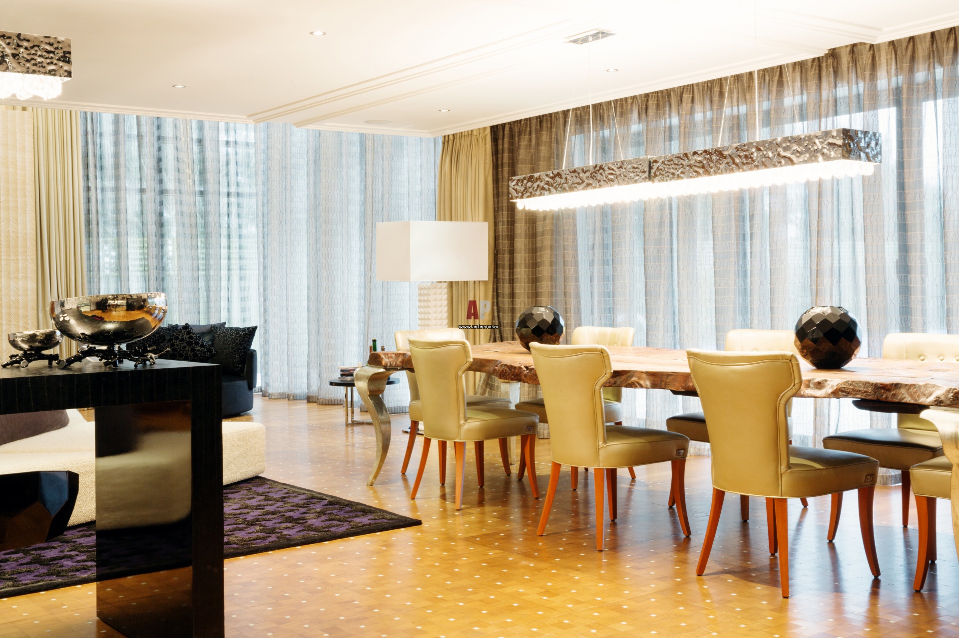 Пол на первом этаже выложен паркетом из светлого дерева с инкрустацией смальтой. Столовая группа, Bizzotto.