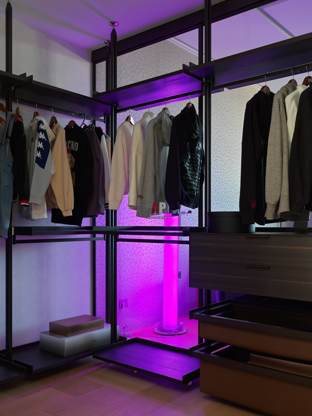В одном пространстве с детской спальней оформлена гардеробная. Системы хранения, Rimadesio.