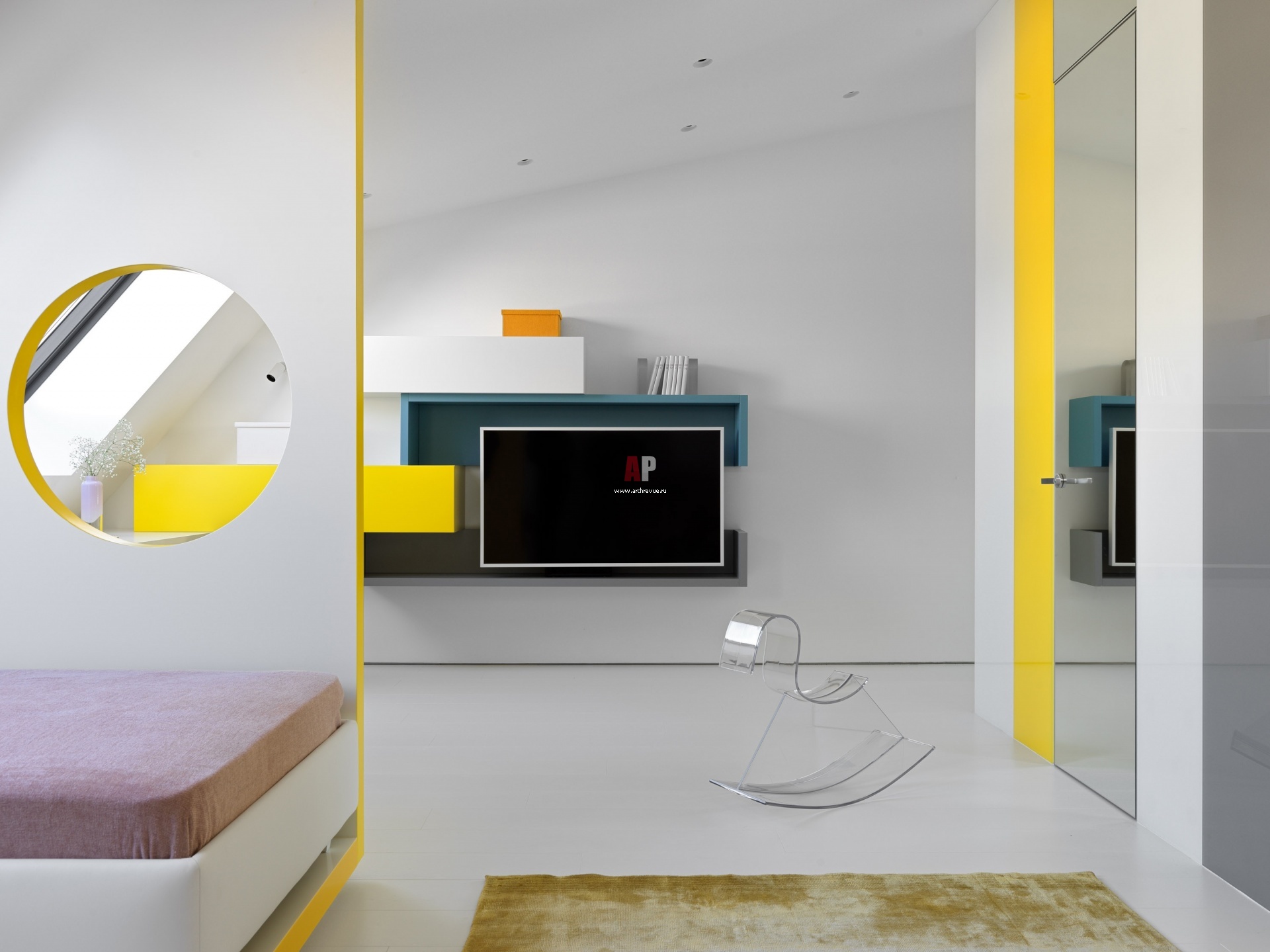 Две отдельные детские комнаты по 10 кв. м каждая архитектор объединил в одну и выделил спальное место и игровую зону. Лошадка-качалка, Kartell.