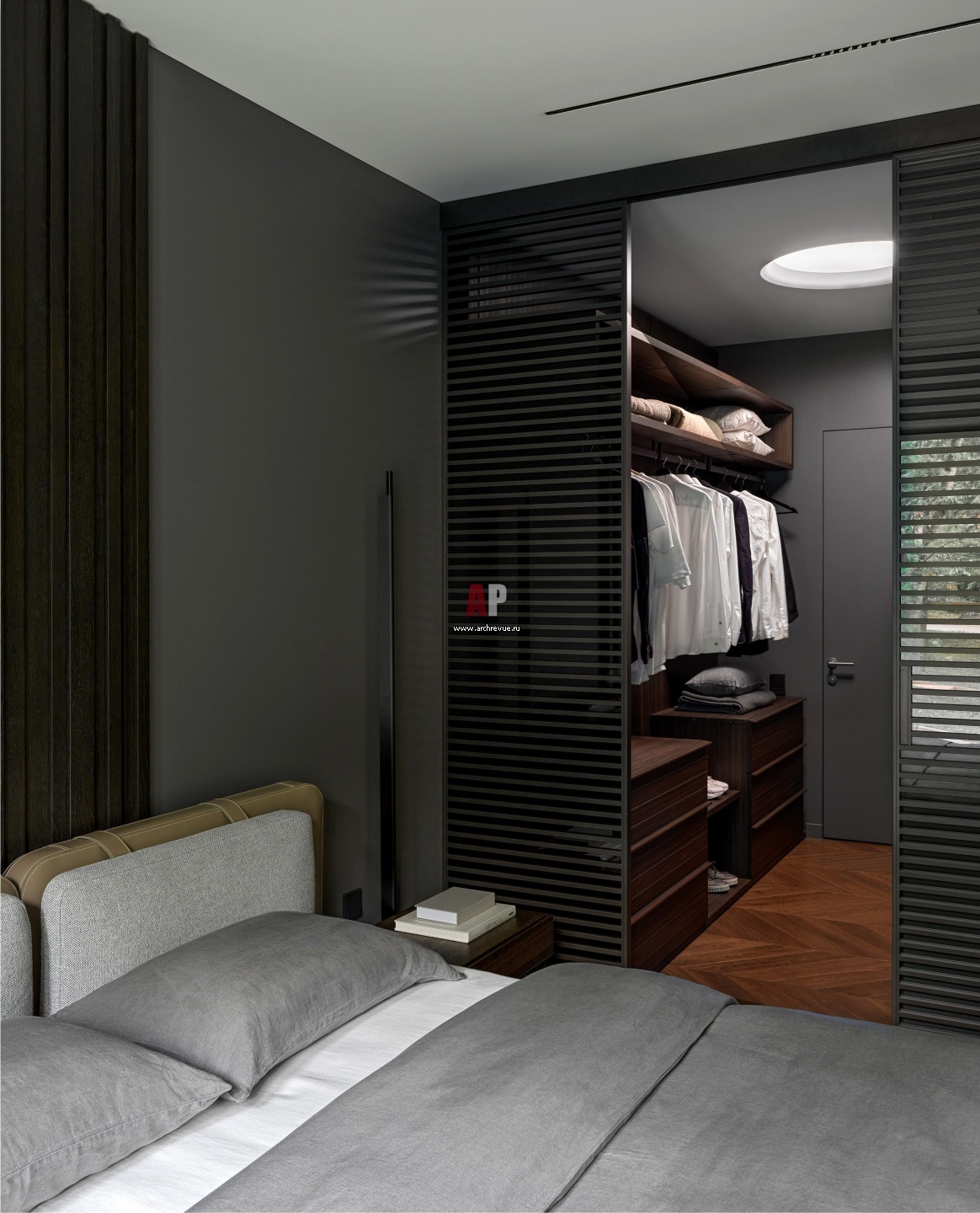Спальня. За раздвижной реечной перегородкой – гардеробная. Перегородка, Rimadesio.