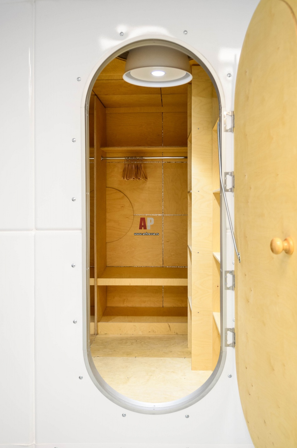 Капсульный гардероб выполнен из дерева, природного внутри, выкрашенного в белый цвет – снаружи.