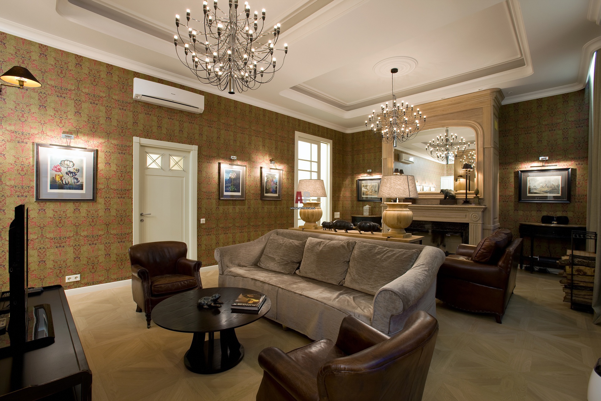 Интерьер гостиной в стиле русского модерна. Кессонный лепной потолок подчёркивает деление пространства гостиной на две зоны - каминную и телевизионную. Обои плотного шоколадного цвета с орнаментом создают уютную обстановку.