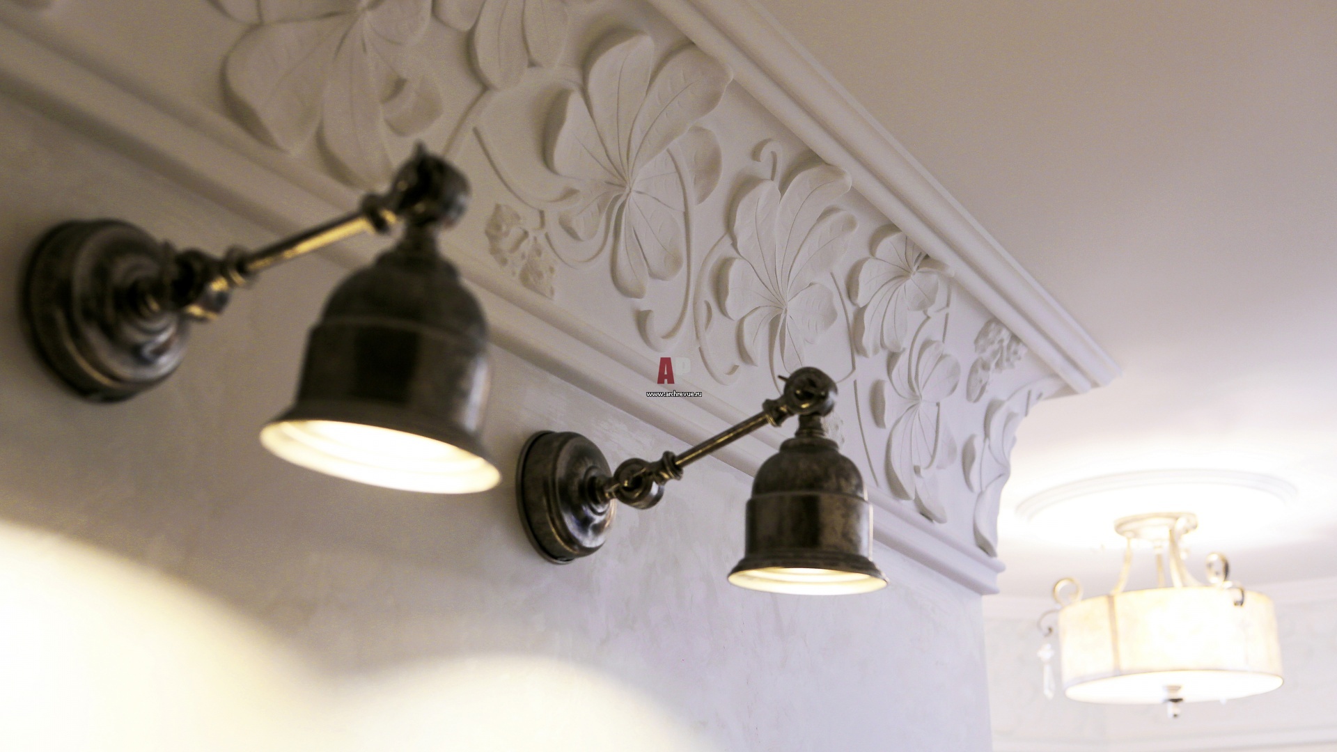 Холл третьего этажа оформлен высоким (40 см) лепным потолочным карнизом из гипса. На нем изображены стилизованные листья орешника.