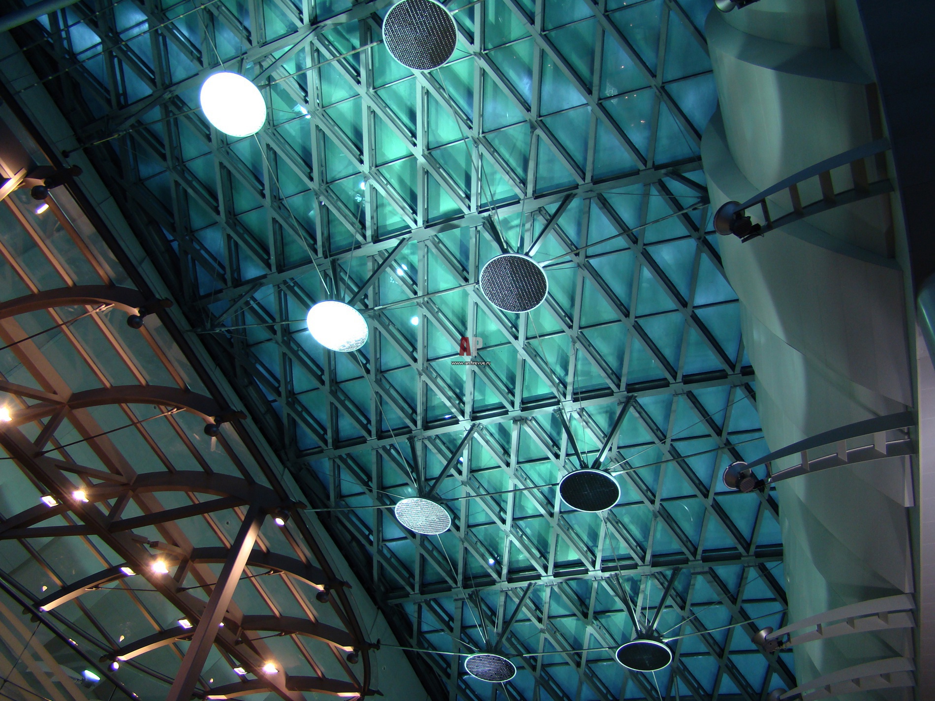 Стеклянные витражи AGC со сложной цветовой гаммой, поставщик Glassbel. Внутренняя и внешняя подсветка здания, а также электроустановочное оборудование, поставщик «Группа MODUL».