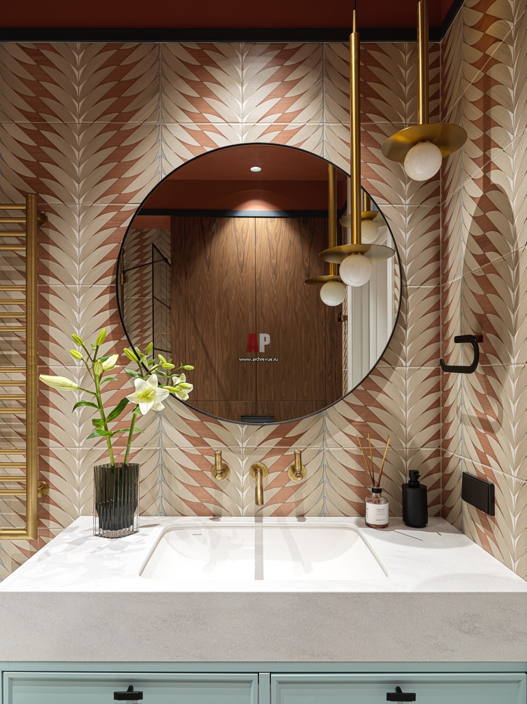 Гостевой санузел. Акцентная плитка в зоне умывальника, Ceramica Bardelli. Светильники, Visual Comfort & Co по дизайну Келли Уэстлер.