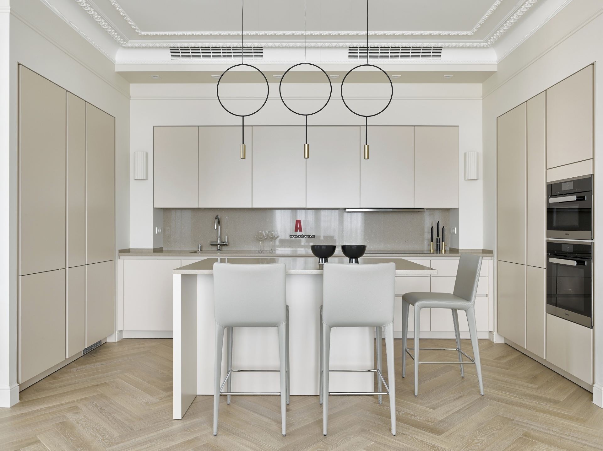 Кухня встроена в нишу и отделена от столовой островом. Кухонная мебель, SieMatic. Барные стулья, Bonaldo. Подвесные светильники, Estiluz.