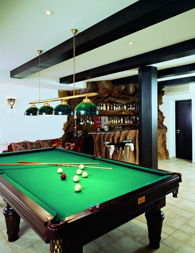 Бильярдная размещается в цокольном этаже, куда можно попасть как из гостиной, так из бассейна.