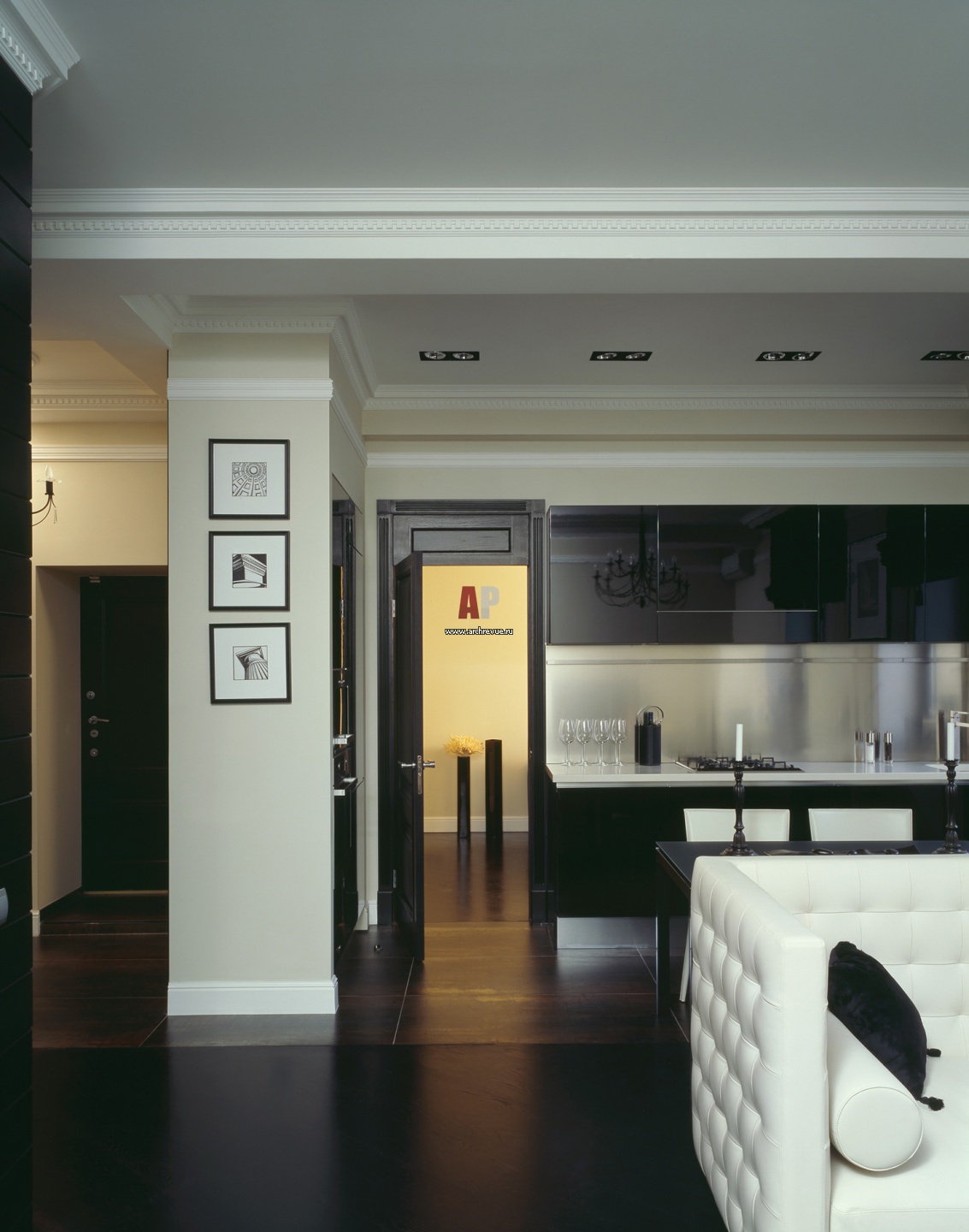 Кухонный гарнитур Composit выполнен в черном лаке. Холодильник и духовой шкаф встроены в специально выстроенный простенок.